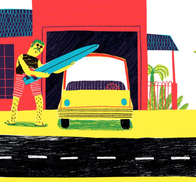 Sur fond de couleurs primaires super-héros, Guilherme Karsten conte la vie d’un surfer qui ressemble à s’y méprendre à un membre des Village People avec sa petite moustache prête à en découdre avec les vagues.