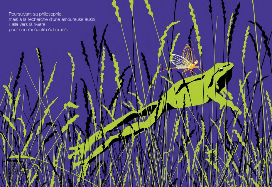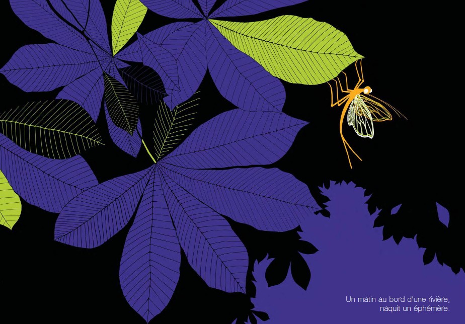 Du mauve, du violet, du noir, ainsi né L’éphémère - de l’imagination de Frédéric Marais - petit insecte fragile qui ne vivra qu’un jour, mais avec beaucoup de passion, et défiant toutes les lois de la nature. Il se battra jusqu’à son dernier souffle, rencontrant l’amour fort en chemin, et finalement, à la nuit tombée sera recouvert … d’une bouse de vache.