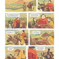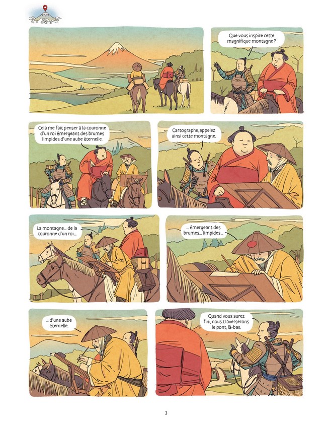 critique : Erik Tartrais nous ramène à l’époque Edo. Un samouraï et son imposant compagnon de route traversent le Japon et jouent avec les images d’Épinal que l’on peut avoir du pays du soleil levant. Les voyageurs ont du mal à choisir leur déjeuner, à installer un jardin zen ou encore à profiter de la fête des cerisiers annonçant le printemps. Mais nous ne suivons pas que ce trio, d’autres personnages et animaux viennent compléter ces tableaux, qui, sous des airs d’estampe, se révèlent un brin moqueur et facétieux.