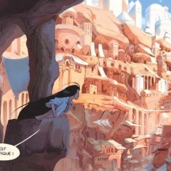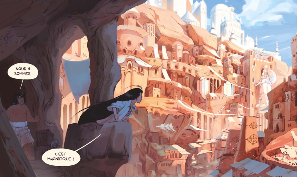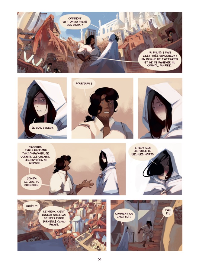 La révolution du mythe passe évidemment par un style graphique original, et Lou Lubie a su y poser une patte rebelle, assez éloignée de son style habituel, celui du didactique-comique qui mêle scènes réelles et personnages métaphoriques. Ici, elle donne vie à une cité, un désert, des hommes et des femmes qui s’inscrivent dans une chronologie qui pourrait correspondre à celle d’un mythe grec, mais en cassant ses codes : la procession funèbre se rapproche de la Perse, les drapés blancs semblent surgir d’une vision idéalisée de toute civilisation, et la technologie, quasi magique, est elle proche à la fois des artefacts d’un monde oublié et d’un artisanat ultime qui pourrait rapidement exister. Enfin, la volonté de colorer, de matérialiser les moments de danse, de chant et de musique, sans notes ni paroles, mais avec des motifs et des thèmes, est une idée inventive et particulièrement envoutante.