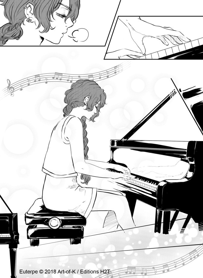 Art-Of-K fait partie de la french touch, cette génération de jeunes auteurs et autrices de bande dessinée qui se sont appropriés les codes du manga. Le scénario d’Euterpe est fondé sur le couple dissonant que forment Jon et Kal. Ce couple est en fait un trio, si l’on inclut dans l’équation l’ombre du Maestro.