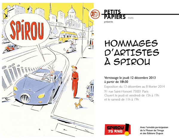Une exposition en hommage à Spirou se tiendra à la galerie des Petits Papiers à Paris du vendredi 13 décembre 2013 au samedi 8 février 2014 (vernissage le jeudi 12 décembre).