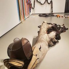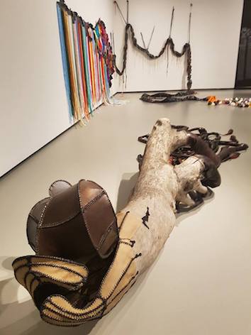"Ndize tail" (2010) et "Umthwakazi" (2016) par Nicholas Hlobo (rubans, caoutchouc, cuir, bois) {{}}