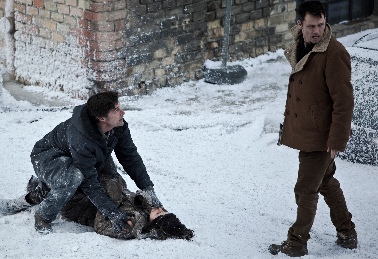 Par ailleurs, Miguel Angel Vivas a dû composer avec un budget étriqué. Extinction ne fait pas pour autant "cheap". Il a été tourné entièrement en studio, dans des décors joliment agrémentés. La neige factice ne fait pas bidon, et rend même plutôt bien à l’écran. La photographie est également réussie, participant à l’ambiance post-apocalyptique de l’ensemble. Dans ces décors, le réalisateur Miguel Angel Vivas a fait le choix d’un drame intimiste mâtiné de fantastique, dans le style de The dead outside (2008). L’idée est tout à fait appréciable, mais le film peine sérieusement à convaincre dans sa première heure.