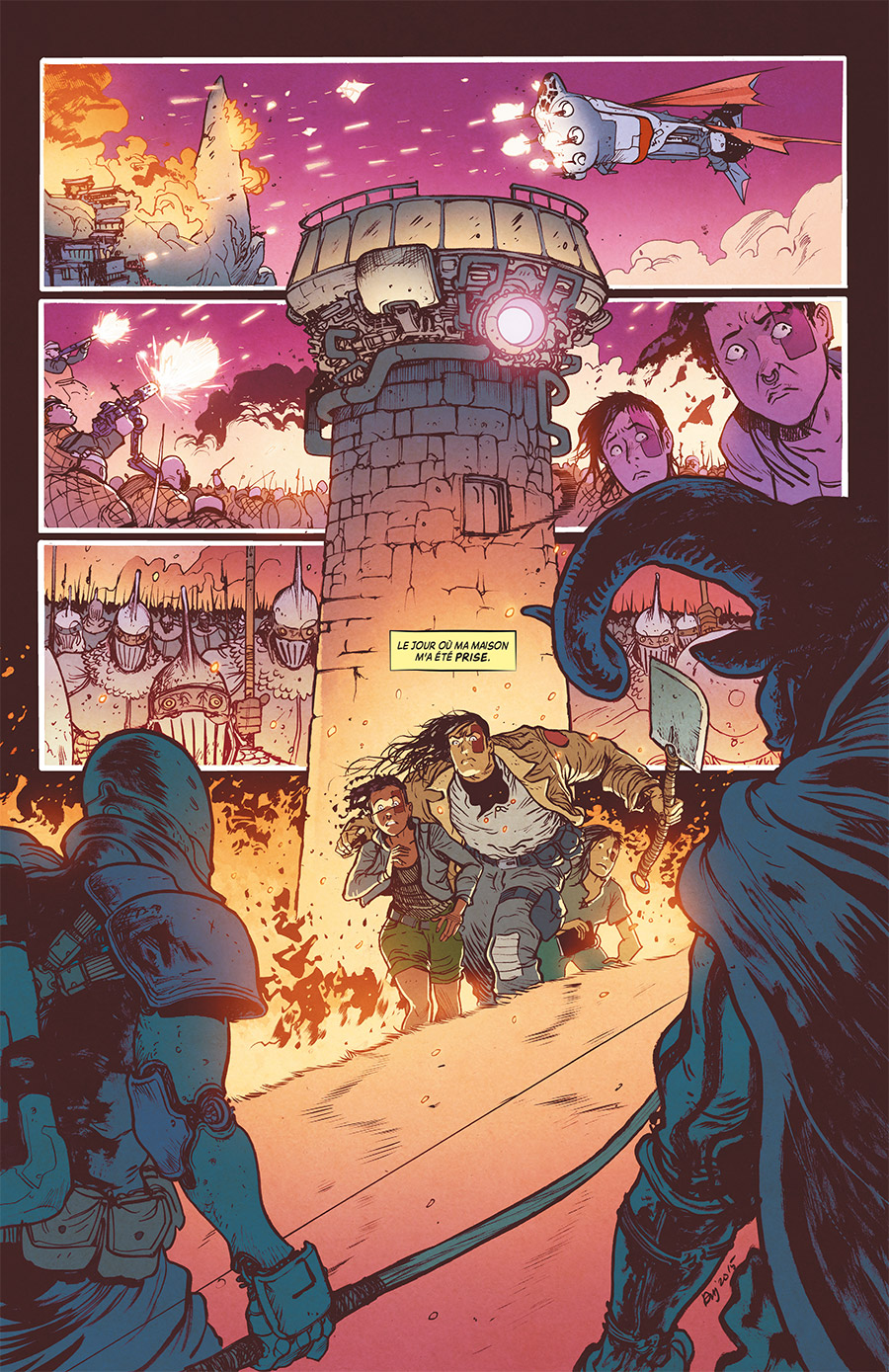 Une claque magistrale, voilà ce que procure Extremity, récit complet et condensé de violence, de sang et d’espérance tout le long, dans une ambiance définitivement remise au goût du jour par Fury Road. Le goût du sang et de la vengeance dans une narration à la Kill Bill s’échappe également, mais heureusement, la dimension artistique empêche de sombrer complètement dans une histoire de guerre et de gangs. Sans pause ni long flashback, Extremity va jusqu’au bout, totalement et férocement, n’attendant pas de suite ni de prélude, formant un tout qui n’a pas besoin d’explications, reposant pourtant sur un monde de machines volantes usées, d’îles flottantes désertiques et de monstres géants fantastiques. Bref, un monde intrigant mais qui n’a pas besoin de bestiaire, une liste de personnages rencontrés les uns à la suite des autres qui n’avait pas besoin d’inventaire, qui se tient seul, jusqu’au bout.