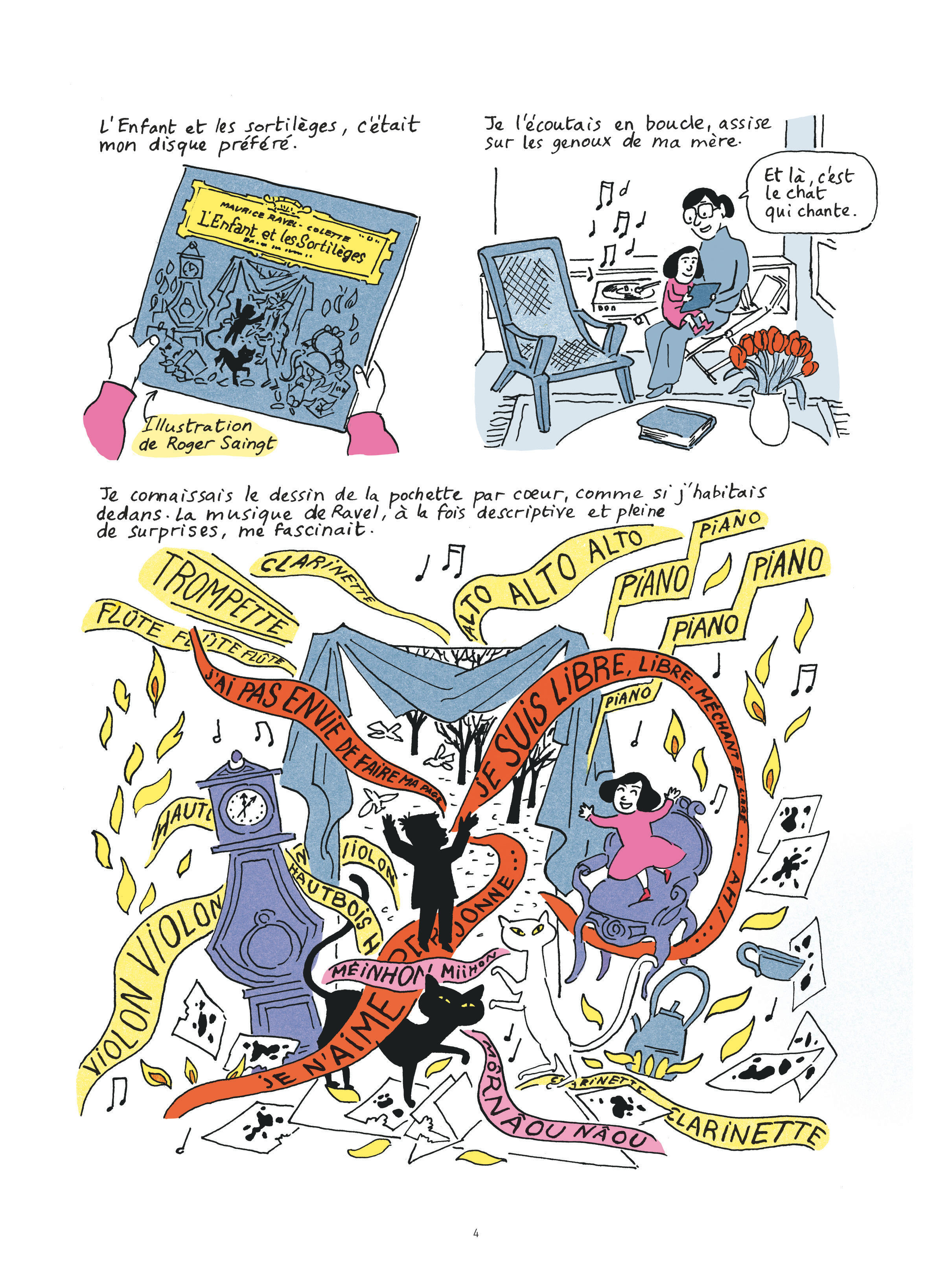 Dorothée de Monfreid ouvre son album par une mise en scène d’elle-même. Au détour d’une vitrine d’antiquaire, elle aperçoit côte à côte un ouvrage de Colette et le disque de L’Enfant et les sortilèges, une des deux fantaisies lyriques composées par Maurice Ravel. Cette rencontre la renvoie à son enfance, où cette œuvre musicale figurait parmi ses disques favoris.