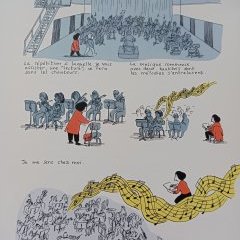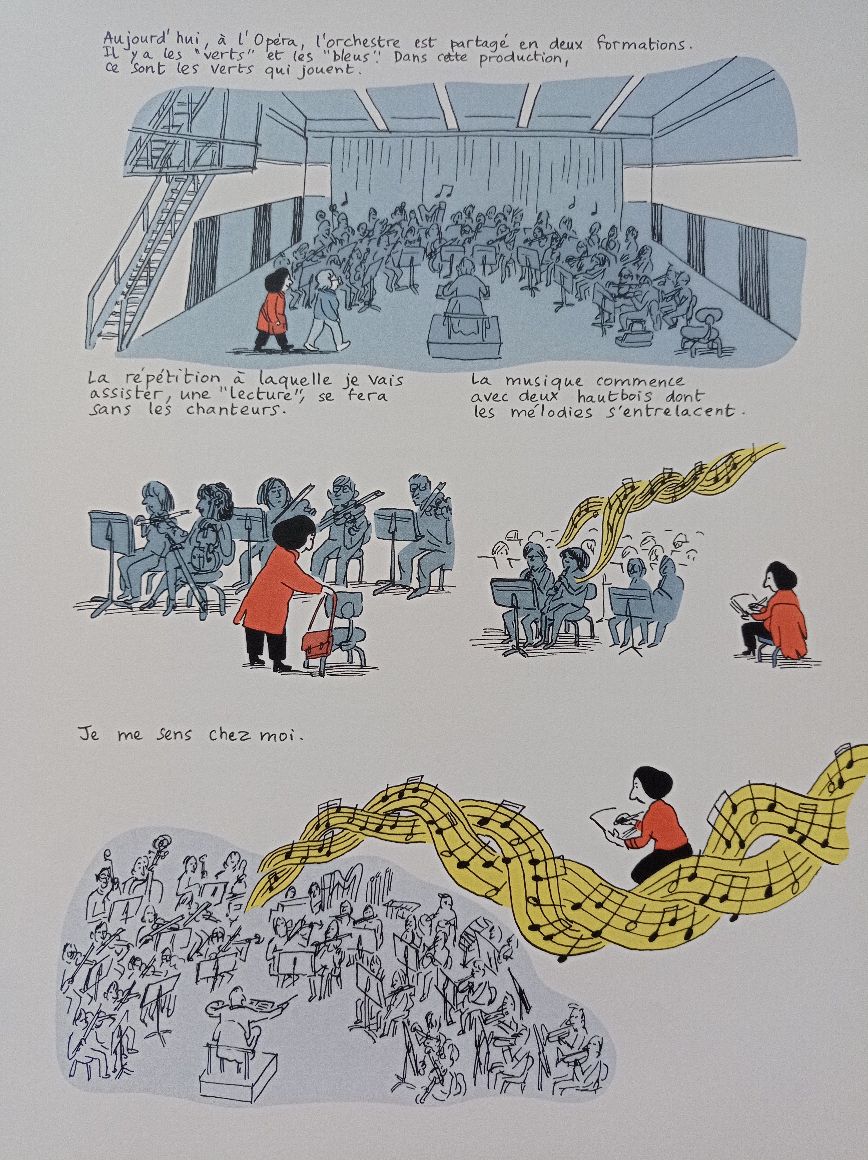 En parallèle de ce récit, Dorothée de Monfreid nous entraîne dans les coulisses de l’Opéra National de Paris qui réunit en fait l’Opéra Garnier et l’Opéra Bastille au sein d’une même direction. Il y a de quoi être impressionnée par ces deux grands établissements. Avec l’autrice, nous pénétrons dans le dédale de couloirs, ateliers, réserves de costumes et de décors, mais aussi les différents espaces de répétition et de représentation. Derrière les murs, nous découvrons une multitude de métiers engagés dans la préparation d’une représentation d’opéra : chanteurs, musiciens, costumiers, maquilleurs, techniciens et régisseurs. Une vraie fourmilière qui suscitera probablement la curiosité des lecteurs familiers ou non de l’Opéra. Carnet de croquis à la main, appareil photo de l’autre, elle tente de saisir tout ce qu’elle observe… Avec elle, nous assistons à l’essayage des costumes, aux premiers essais de chants et aux différentes répétitions musicales.