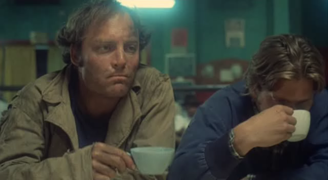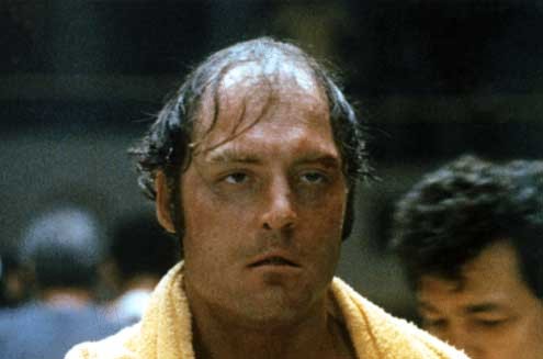 Si Tully, par sa détermination, parvient plus ou moins bien à renverser la vapeur une ultime fois lors d’un combat aussi épique que désespéré -se prouvant à lui-même qu’il est encore capable de se dépasser pour toucher du doigt son rêve, Ernie n’emprunte nullement la route pavée d’or vers laquelle il semblait naturellement destiné. Archétype d’une jeunesse sacrifiée, il s’avère au final un boxeur dont le talent est mal exploité et retourne peu à peu, comme son anti-modèle Tully, vers une vie sans relief où l’ambition, la volonté de réussir et de s’élever, bases fondamentales sur lesquelles reposent tout la civilisation américaine, sont annihilées purement et simplement. Reste la débrouille, à coup de petits boulots journaliers, pour survivre et prendre soin de sa famille, le sacrifice restant l’un des thèmes de prédilection du réalisateur. Contrairement à Rocky, que certains jugeront trop optimiste, Fat City offre la vision d’une Amérique morose et déprimante où les êtres sont condamnés à stagner -en opposition au mouvement perpétuel inhérent à l’activité du boxeur- et ne peuvent quitter leur pauvre condition, condamnés à répéter inlassablement un même schéma. Stacy Keach, avec ces airs de Vincent Gallo, est un vrai bon gars, comme Rocky, mais il doit sans cesse dealer avec les aléas de la vie et combattre ses propres démons : la peur de vieillir, les regrets, la conviction de n’être personne et de n’avoir aucune place dans la société.