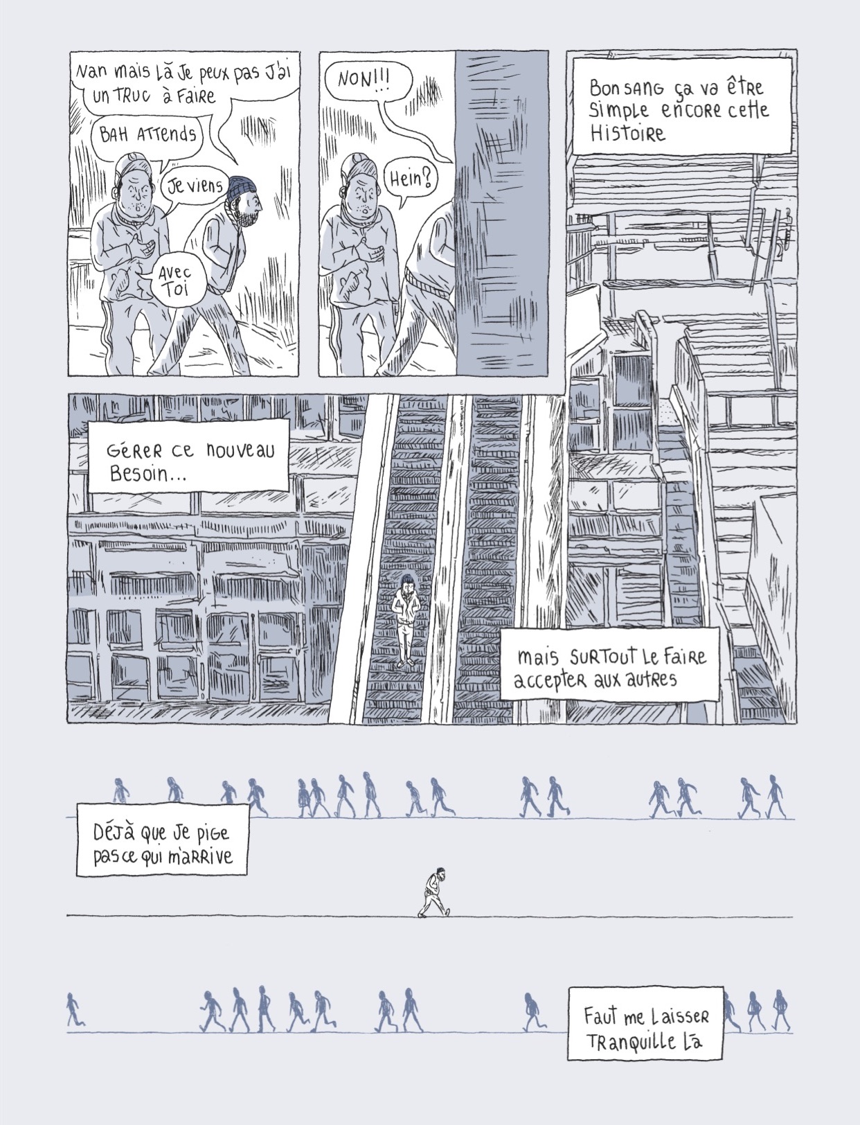 Il en va de même de son talent. Comme peu d’auteurs, il parvient à faire coexister description précise et extrapolation comique voire absurde, introspection personnelle et échanges collectifs, humour corrosif et poésie urbaine… Son dessin entremêle réalisme - par ce qu’il saisit et par son sens du détail - et semi-réalisme grâce au recours à certaines exagérations (d’attitudes, d’expressions, de gestes…).