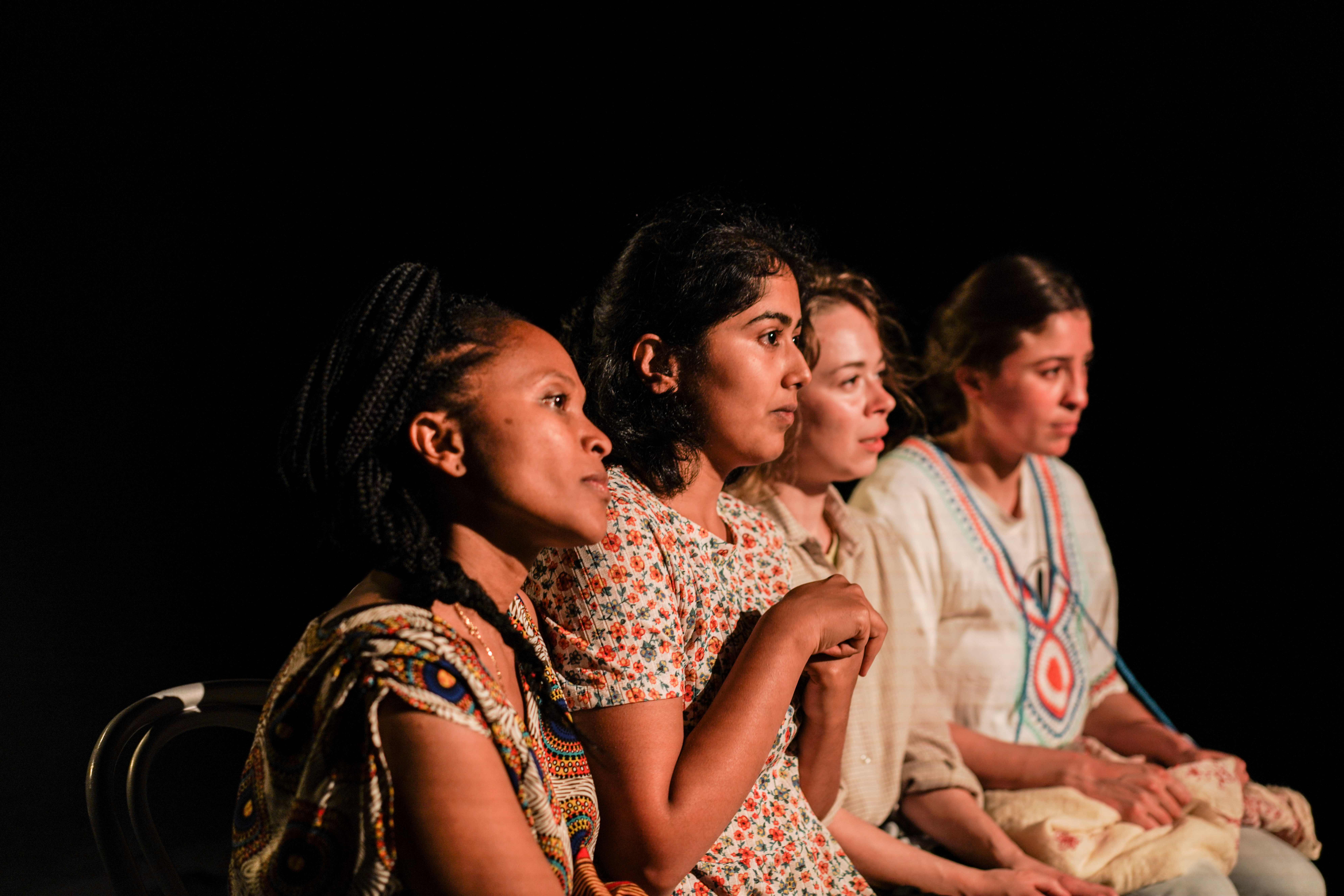 Critique : Quand les spectateurs entrent dans la salle, les quatre comédiennes sont déjà installées sur cette scène dépouillée de tout décor. Elles n’ont rien à cacher et s’apprêtent à nous ouvrir leur cœur, elles qui ont fui la guerre, la censure, les violences faites aux femmes. Rien de politique. Aucune récrimination. C’est la voie de la poésie qu’emprunte ce texte sensible pour nous parler de nostalgie et de solidarité, d’incertitude et d’espoir, de douleur et d’humanité. Mêlant effets scéniques et bruitages sonores, la mise en scène restitue avec précision la terreur des bombardements, la perte de repères et la chaleur de rencontres opportunes. Si parfois l’onirisme s’invite, ce n’est que pour semer quelques notes féeriques sans jamais perdre de vue l’essentiel du sujet. Placées au bord du monde, celles que l’on désigne du vocable souvent arbitraire de « migrantes » n’en sont ni totalement rejetées, ni totalement intégrées. Elles sont à la frontière du monde, cette frontière qu’elles rêvent de rejoindre sans savoir où elle se trouve, ni ce qu’elle leur réserve.
