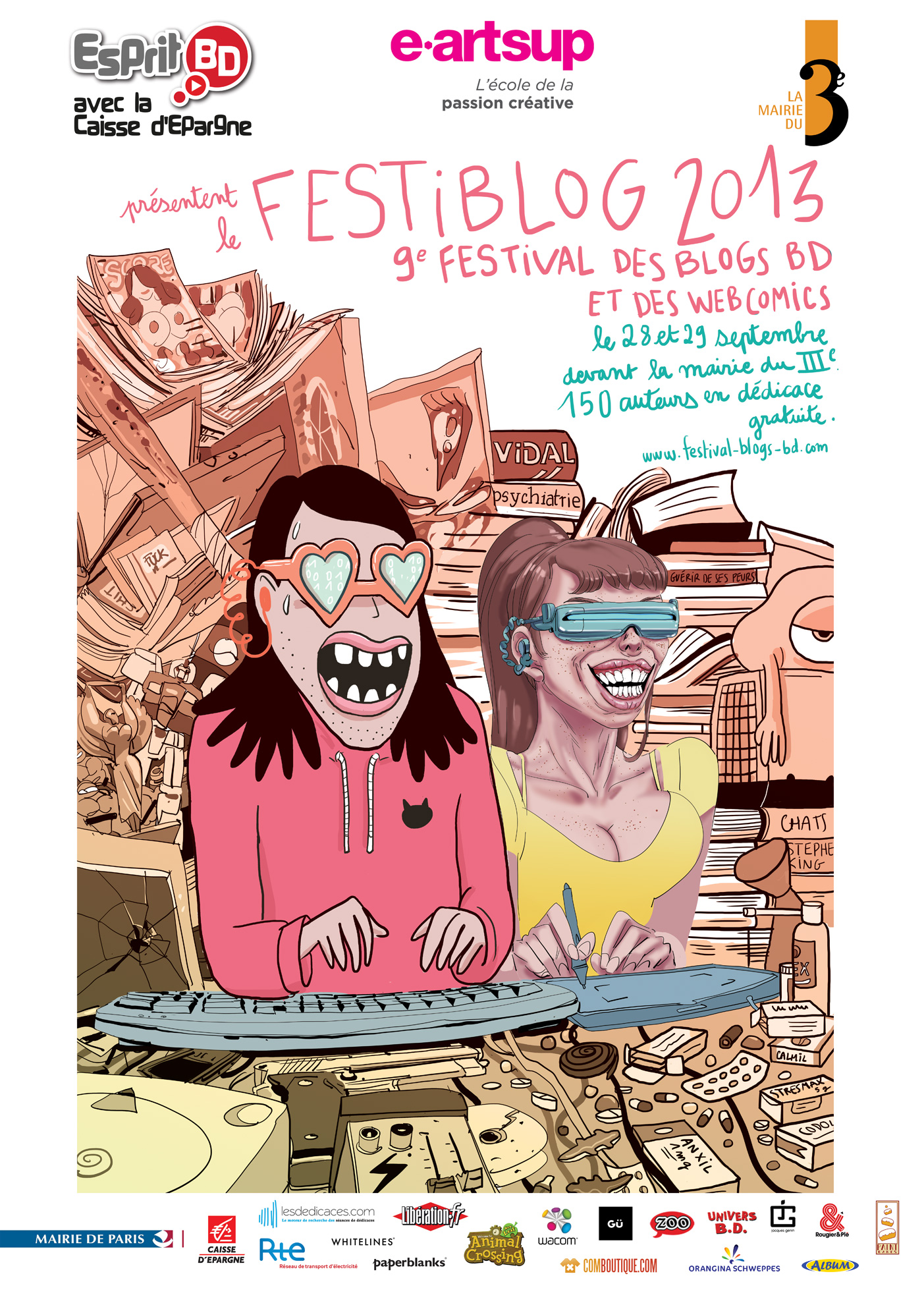 Enfin, quelques mots sur la marraine du festival : Leslie Plée. Diplômée de l’Ecole Estienne, elle a suivi une formation de libraire avant de se consacrer entièrement au dessin à partir de 2007. Habituée du Festiblog, elle est l’auteure de nombreuses bande-dessinées comme Vivre vieux et gros (Delcourt), Points noirs et sac à dos (Fluide G.), L’effet kiss pas cool (Gawsewitch), moi vivant vous n’aurez jamais de pauses (Gawsewitch) et 13m28 (Manolosanctis).