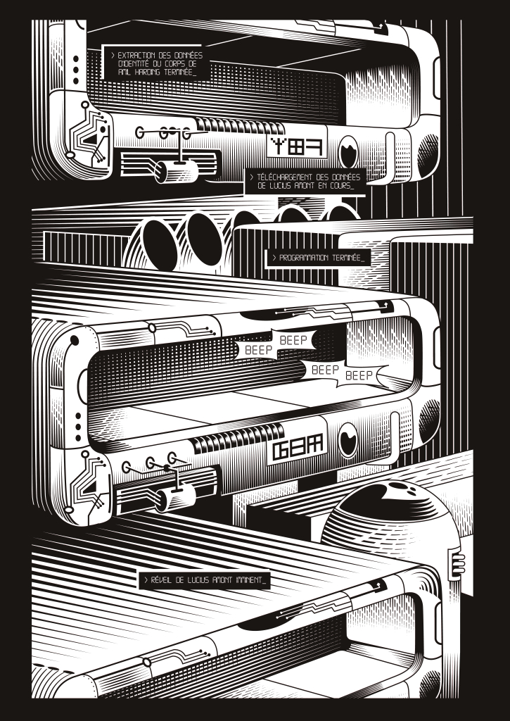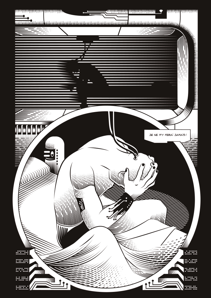De fait, la force principale de l’album réside dans son choix, bichromie noir et blanc tachetée d’un rose pâle et peau, formes kaléidoscopiques aussi hallucinantes que fascinantes, décors de SF noire, comme un polar où I Robot inverserait les rôles entre hommes et robots (et en cela pas très loin d’un Latium de Lucazeaux). L’intelligence artificielle, ses limites et ses promesses, sont bien présentes mais c’est son traitement graphique qui intéresse, une fois encore, avec des visages, des traits qui jouent sur les différences et les résistances.