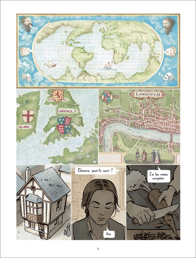 Comment s’intéresser à la cartographie du XVIe siècle ? Cette question, Jean Dytar ne se l’est probablement jamais posé. ¨Pour le comprendre, il suffit de poser les yeux sur son œuvre, ou simplement feuilleter le catalogue des dernières pages qui montrent toute son admiration pour le travail d’orfèvre que certains dessinateurs de l’époque pouvaient accomplir. Florida est un hommage, une recherche historique sur les projets de plusieurs chefs protestants de l’époque, dont certains finiront hélas mal lors de la Saint-Barthélémy, mais aussi un récit réaliste d’une famille, d’un homme et de sa femme Éléonore, narratrice et par ailleurs véritable héroïne de l’album. Ce couple est passionné de science et de voyage, mais la réalité a un carcan peu propice aux meilleurs des projets, et des besoins impérieux qui empêchent une liberté totale. Jonglant avec les années, renvoyant à des jeunesses perdues et des voyages empêchés, le scénario tisse une trame tranquille, sans soubresauts mais avec des rencontres et des temps longs, comme la vie en réserve souvent. Pas de duels, pas de massacres qui pourraient rappeler Agrippa d’Aubigné, il faut y voir la modestie d’une œuvre subtile et habile.