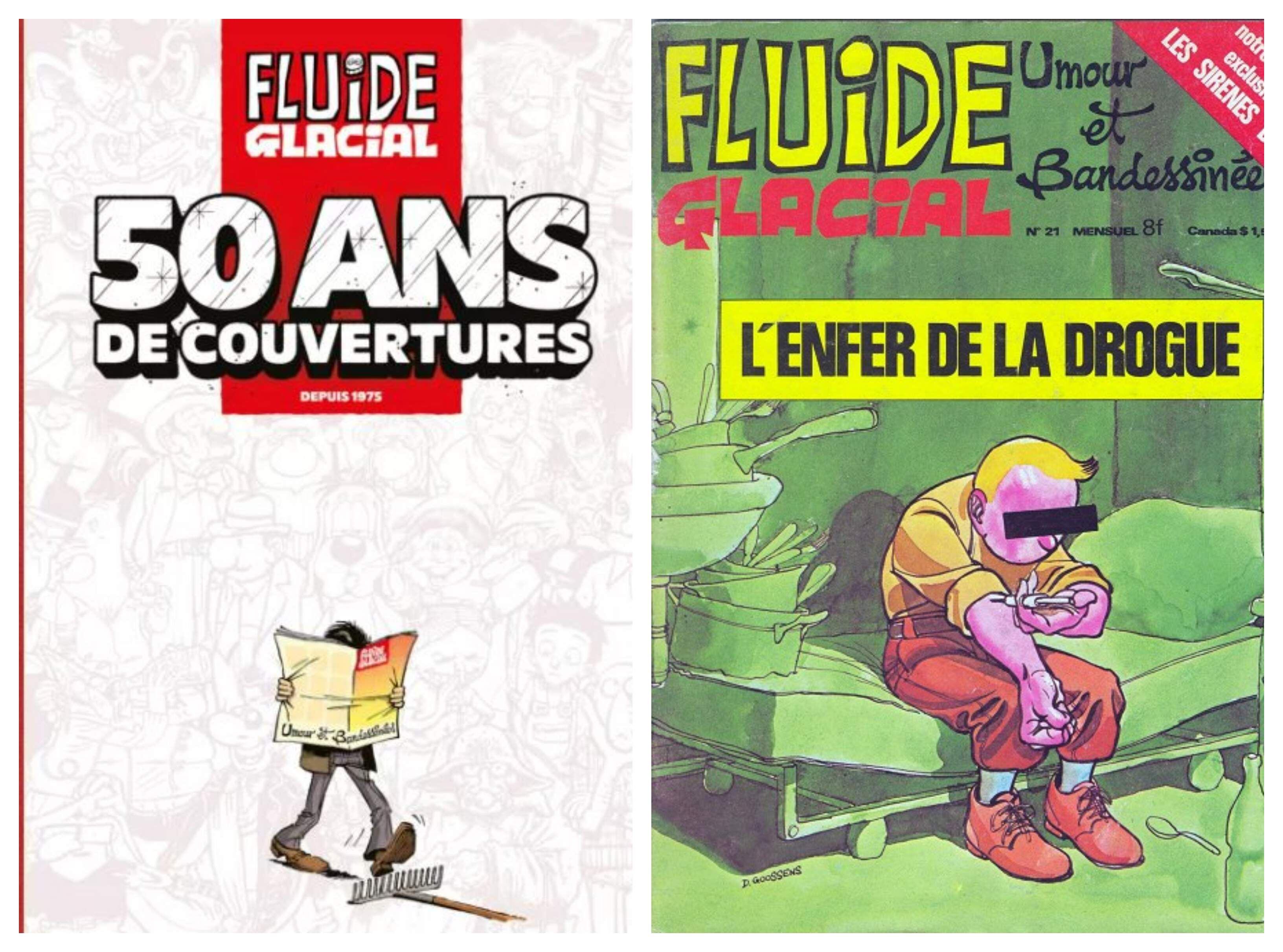Fluide Glacial, 50 ans de couverture depuis 1975 raconte l’histoire du magazine Fluide Glacial, de ses dessinateurs et dessinatrices grâce à cinquante couvertures choisies avec soin.