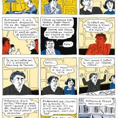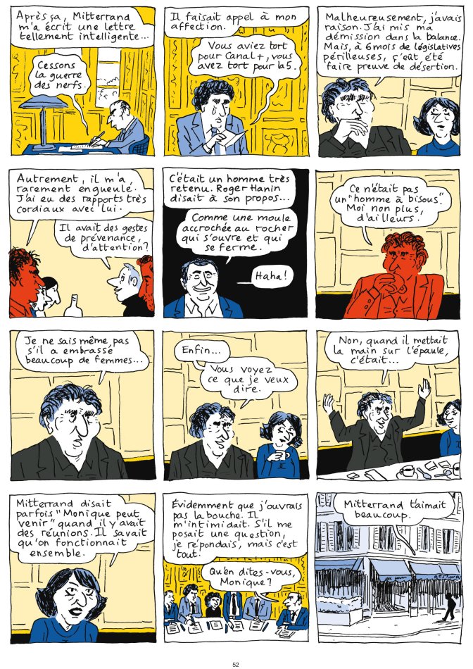 Dorothée de Monfreid enveloppe cette biographie d’un ton politico-sardonique avec un dessin lui aussi entre deux mondes, pas loin des couleurs et décors du roman graphique Quai d’Orsay et avec les têtes dignes d’une caricature de première page du Canard Enchaîné. Le ton et le fond se rejoignent donc dans cette petite centaine de pages qui impliquent un bon paquet d’hommes et de femmes du monde politique, figures françaises et internationales à l’appui, des écrivains, artistes, cinéastes et autres membres des cercles de la Culture d’un quart de siècle, entre 1970 et 1995. Entre sérieux et sarcasme, la palette graphique joue à la balance mais crée un style unique qui convient parfaitement.