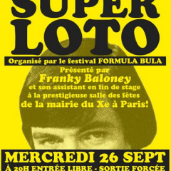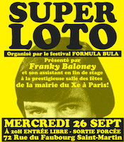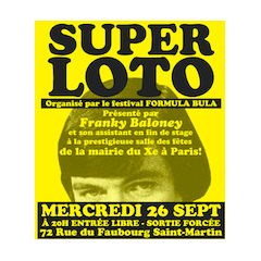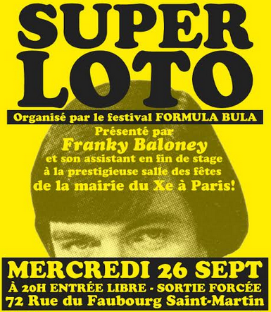 Qui dit fête, dit jeux. Quoi de mieux pour les lancer les festivités que de se retrouver autour d’un loto organisé dans salle des fêtes de la Mairie du 10e lors d’un inédit Super Loto Bula, présenté par Franky Baloney (aka "le roi de la quine"), où il faudra être le premier ou la première à faire un carton plein et à hurler "quine !!!!" afin de remporter une Planche pour l’apéro (tête-à-tête avec un auteur durant le festival) avec Émile Bravo, Marie Caillou, Fred Bernard, Martes Bathori, Marc Boutavant, Dav Guedin et Anne Simon. "Mais aussi des bandes dessinées, des goodies, des disques, des charcuteries fines..."