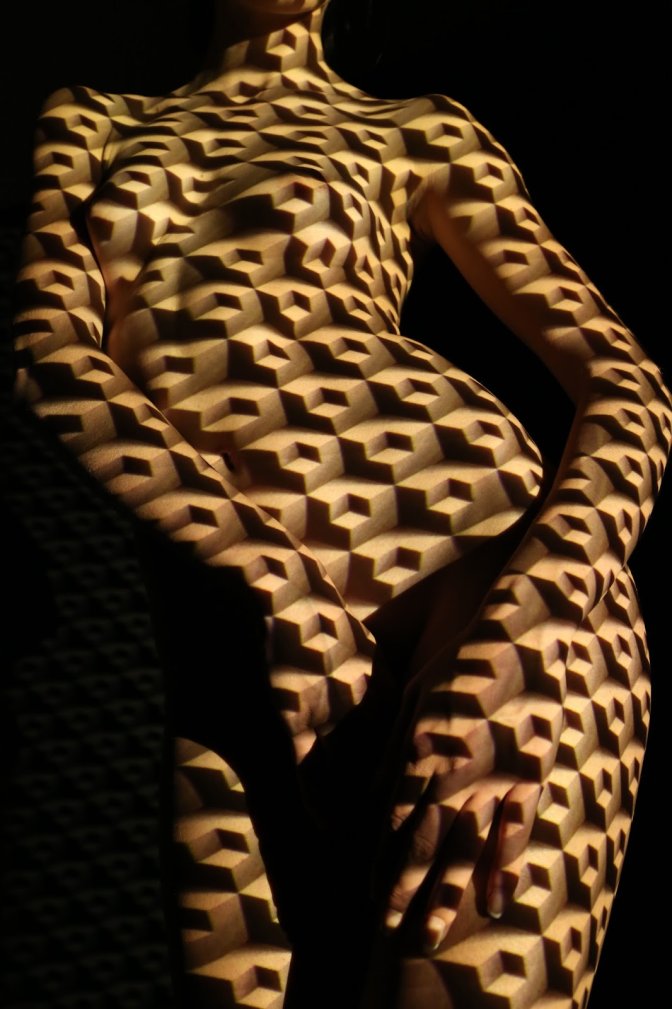 Le concept est proche de l’oxymore visuel ; la femme nue placée dans une pièce noire est ici revêtue d’un habit de lumière. Haute couture où les points de broderie, projections de lumières (ligne, cercle et autres formes notamment cursives) sur le corps statique ou en mouvement des modèles, s’appellent, selon l’artiste, projograme, linéogramme, mouvogramme et créagramme.