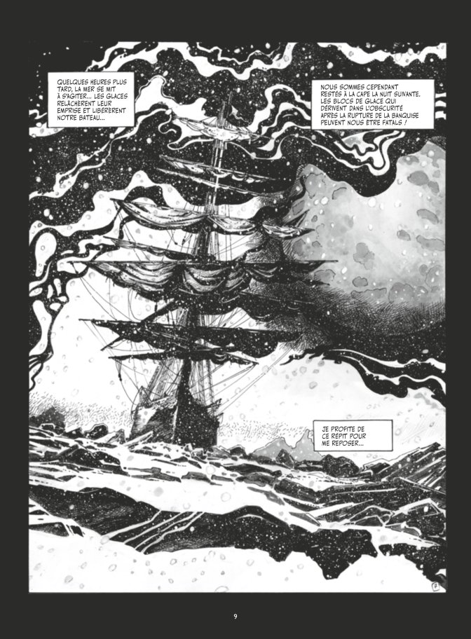 Après l’excellent Dracula, Georges Bess s’attaque avec Frankenstein à un autre classique du roman gothique. Le dessinateur use d’ailleurs des mêmes ingrédients graphiques et narratifs que pour son précédent album : fidélité vis-à-vis de l’œuvre originale (Bess abandonne simplement la forme épistolaire du roman, effectivement peu compatible avec la narration en bande dessinée), utilisation du noir et blanc avec une densité de l’encrage, souci du détail et grande générosité dans les décors et la représentation des personnages.