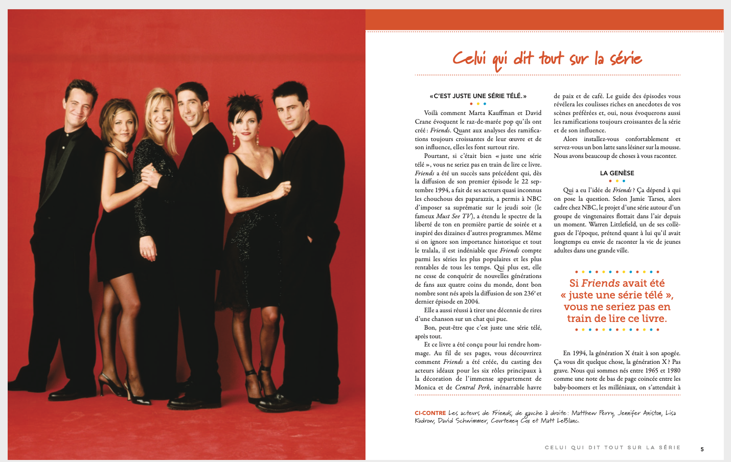 Si, le plus souvent, l’ouvrage verse dans la célébration du phénomène Friends, ne soyons pas dupes : c’en est le principe. Toutefois, grâce à son ton très direct et engageant, il parvient à captiver le lecteur, en le poussant agréablement à se laisser porter jusqu’au bout de ses 250 pages, qui filent à la vitesse de l’éclair.
