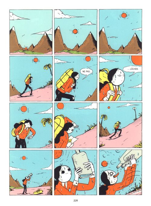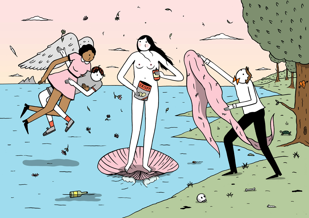 Le dessin, s’il peut paraître simple, se révèle particulièrement ingénieux et incarné, conférant du dynamisme à ces anecdotes complètement folles. Tenue, inventive, allant à l’essentiel tout en s’autorisant des délicatesses esthétiques, sa ligne déploie une énergie folle qui rappelle la verve d’Emilie Gleason. À noter que certains dessins en pleine page, qui séparent les chapitres entre eux, convoquent et parodient toute une imagerie fortement connotée. L’intertextualité fonctionne alors plus sur le mode du clin d’œil, à l’image de la couverture qui fait référence aux Peanuts sous fond de vanité (on trouvera, entre autres, des allusions au Caravage, aux peintures de la renaissance, autant qu’à des œuvres de la pop culture).
