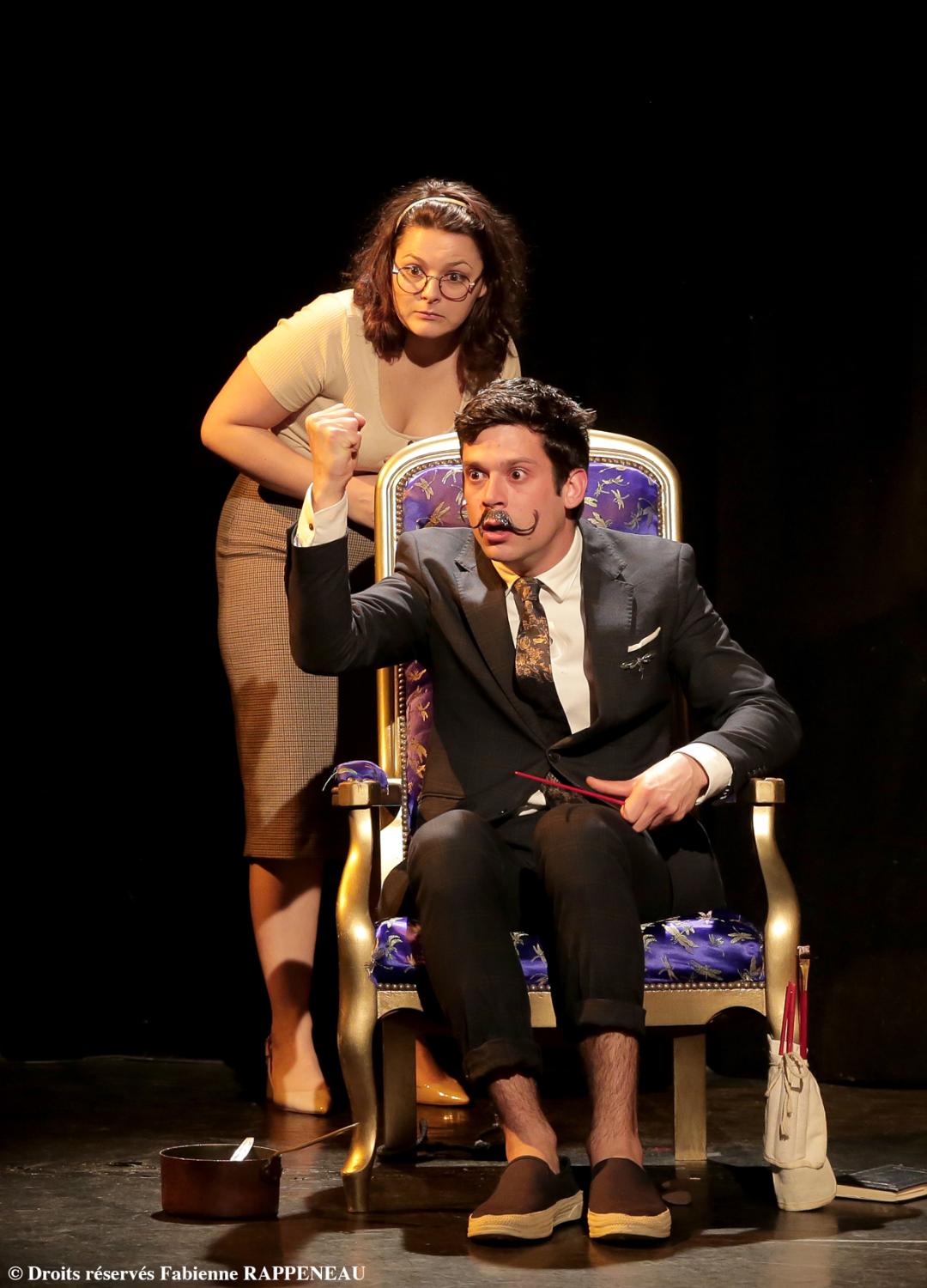 A côté de lui puis tout contre, Eva Ramos incarne avec fougue Gala, autrement dit Elena Ivanovna Diakonova, d’abord muse de Paul Eluard et de Max Ernst. Condescendants, ils ont en commun la faculté d’humilier leur entourage, avec violence et insultes. Les duos s’entrecroisent avec l’arrivée de Maria, sœur de Dali (interprétée avec beaucoup de justesse par Lola Blanchard), qui change de couleurs et de facettes au fil de l’histoire et des visions droguées de Salvador. Avec une technique très maîtrisée, Théo Delezenne est successivement Paul Éluard, amant martyrisé par Gala, comploteur et plombier. Les histoires sont à la fois parallèles et entrecroisées, pleines de contrastes et de similitudes. Il y a une parfaite harmonie entre les quatre comédiens électriques, au courant continu, grâce à un rythme effréné.