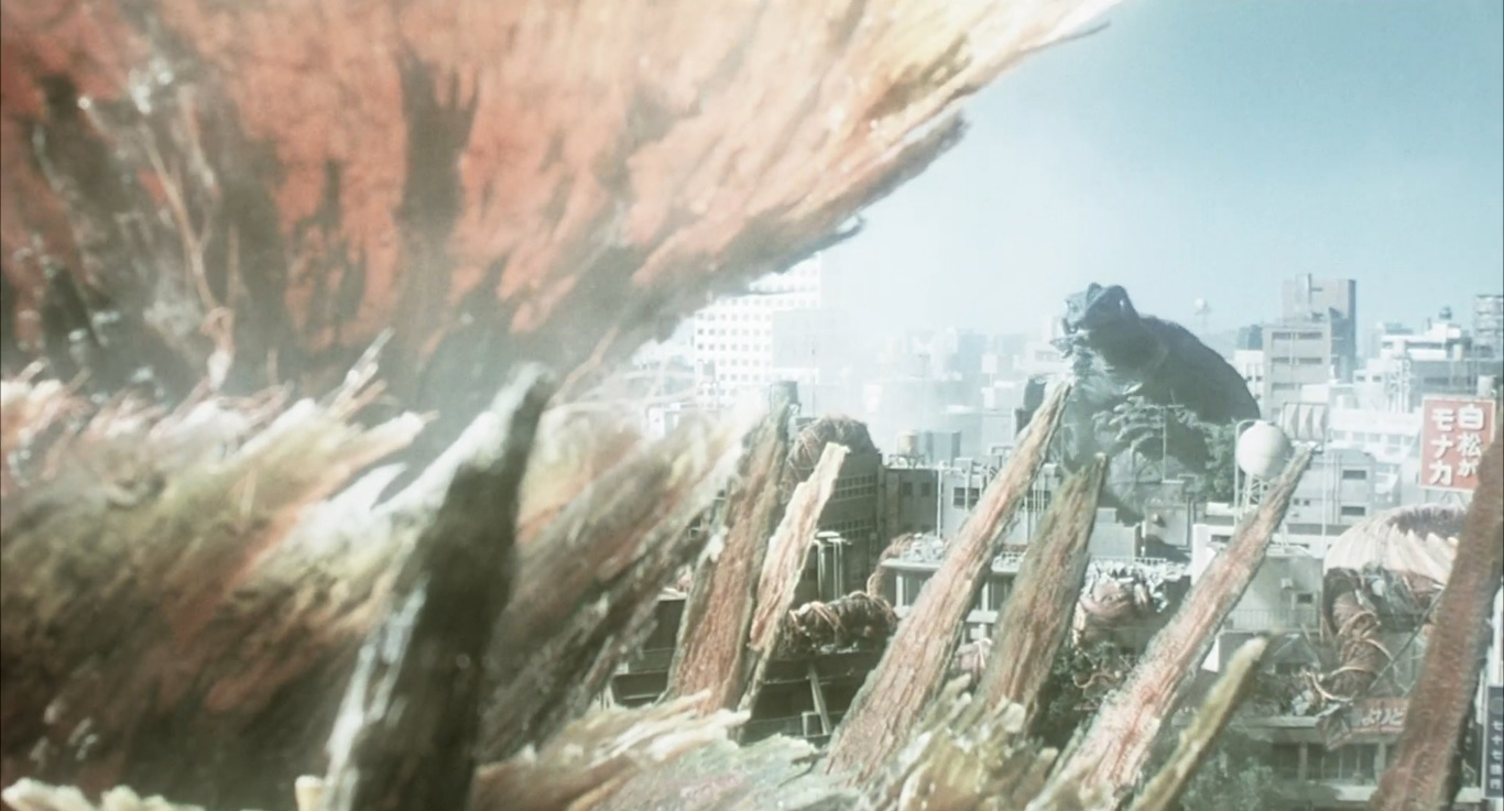 Tourné davantage du côté du film d’action pur via de multiples renvois à Aliens, le retour, ce choix de Kaneko se révèle quelque peu douteux car l’aspect désuet de certains effets ne lui permet pas vraiment de soutenir la comparaison avec Cameron lors des scènes d’action à échelle humaine. Il s’en sort mieux avec les affrontements de monstres géants où les japonais démontrent une fois de plus tout leur talent et leur sens du détail via de superbes maquettes et costumes. Les quelques tentatives de numérique sont un peu maladroites mais s’intègrent relativement bien à l’ensemble et sont rattrapées par l’utilisation d’animation en stop-motion. Le but des artisans derrières les films de Kaiju n’a jamais été, contrairement à Hollywood, de créer une illusion parfaite mais de provoquer un certain émerveillement via un processus presque théâtral qui met l’emphase sur l’artisanat cinématographique à l’ancienne. Un vrai régal pour les amateurs.