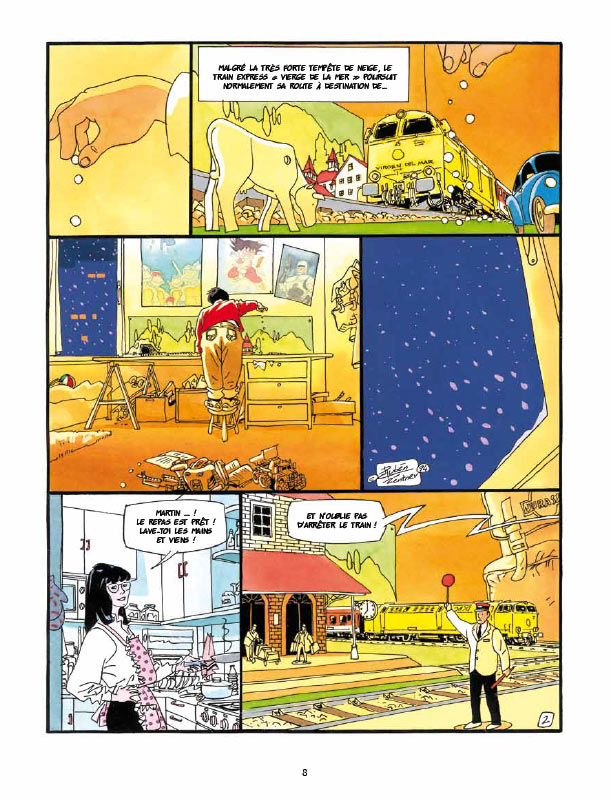Cette BD de Jorge Zentner et Ruben Pellejero présente des instants où rien n’est ce qu’il semble être. Coïncidences narratives ou bien véritable magie au parfum d’étrangeté ? C’est la question que soulève la première histoire, Neige. Les teintes jaunes et sombres dominent. La chaleur d’une chambre où un enfant joue au petit train face à l’obscurité d’un tunnel où sont bloqués les passagers d’un grand train. Tout est raconté par le regard d’un enfant ou bien celui d’un narrateur omniscient ? Le narrateur a aussi un rôle capital dans la deuxième histoire, Blues, où nous suivons les pensées de... Mais nous ne vous en dirons pas plus pour vous garder la surprise. Là, le bleu de l’eau domine autour d’une relation bizarre, où le blues se lie au bleu de l’eau.