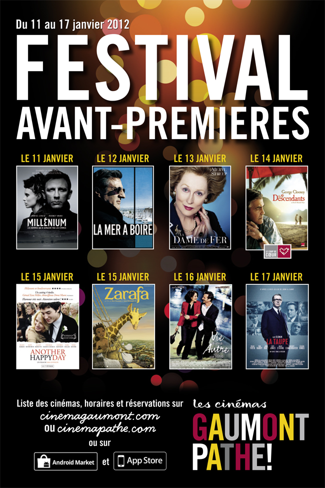 Entre le 11 et le 17 janvier, 52 cinémas Gaumont proposeront 8 grosses avant-premières, parmi lesquelles celles de Millenium ou La dame de fer...