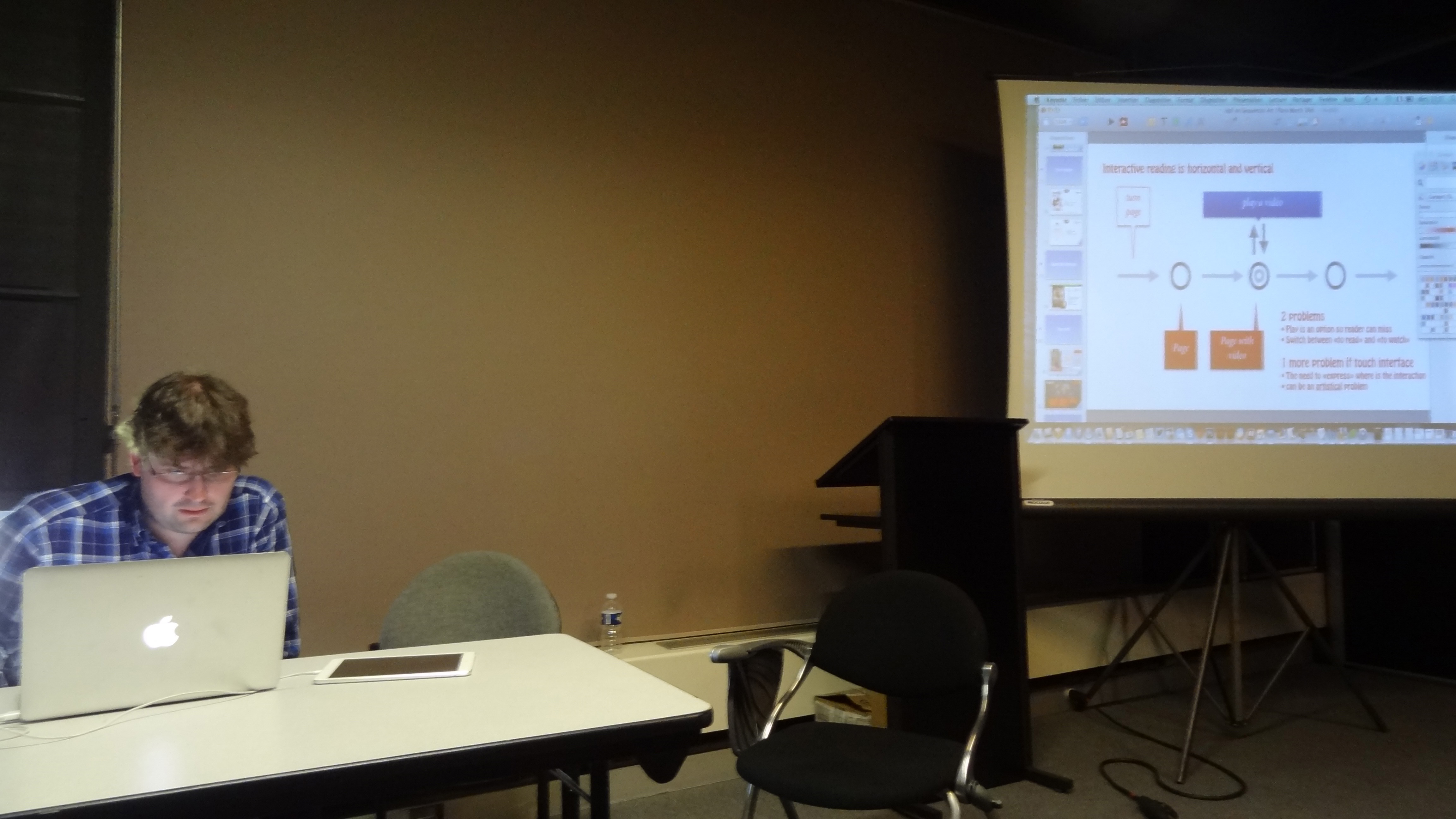Le pauvre a dû enchaîner à une vitesse astronomique les différents styles pris en charge ainsi que ceux non pris en charge et au final, il ne lui restait que cinq minutes pour parler de l’événement en soi : trente-trois heures pour réunir auteurs, dessinateurs et programmeurs, former des équipes afin de créer des histoires pour ce format ePub à partir de thèmes donnés le jour du lancement.