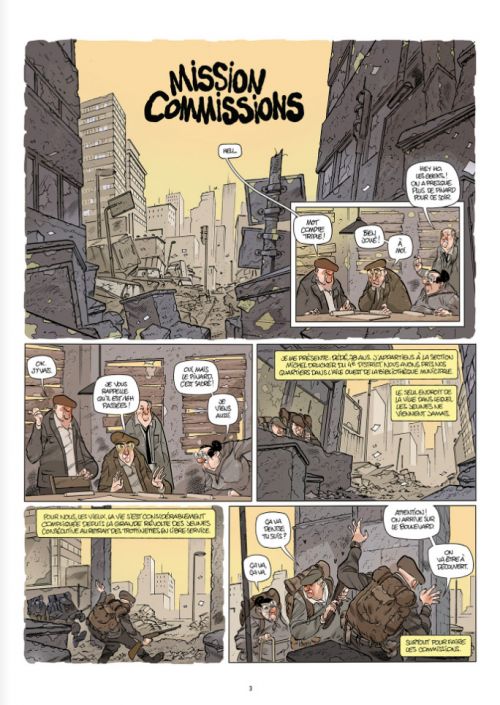 Tout cela traité avec humour, bien sûr. Un humour cinglant tout le long de ces histoires courtes. Chaque tome présente un petit lot de récits étalés sur quelques pages, le temps d’une mission, d’une mésaventure et d’un retournement souvent inattendu. Nous sommes plutôt du point de vue des vieux, dont on finit par repérer quelques personnages phares, Dédé, entre autres, qui ne lâche rien ou presque.