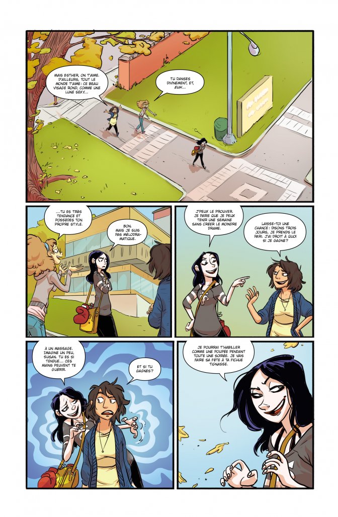 Le trait léger employé par Lissa Treiman pour donner vie à ces personnages aident énormément à nous les rendre sympathiques. Et pour montrer que le choix du style influence forcément notre perception, ce premier tome se conclut sur des couvertures et essais de couvertures de Lissa Treiman et de différents auteurs. C’est là qu’on se rend compte que le duo Treiman au dessin et Allisson au scénario fonctionne parfaitement bien. Car les situations se révèlent parfois aussi peu réalistes que le dessin, et apporte soudain un souffle d’absurde, comme cette mère qui embarque son fils dans son cabas ou cette feuille de papier innocente que Susan remet à Esther et qui... Mais non, nous ne vous en dirons pas plus...
