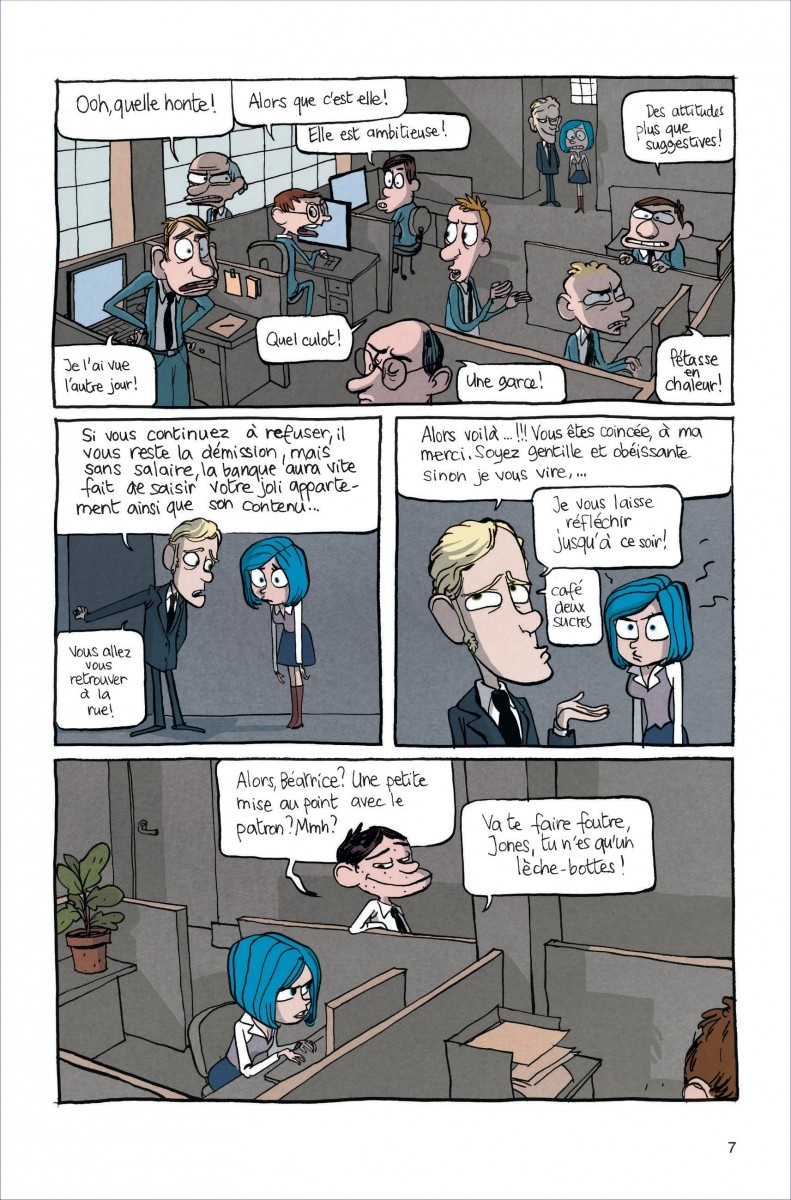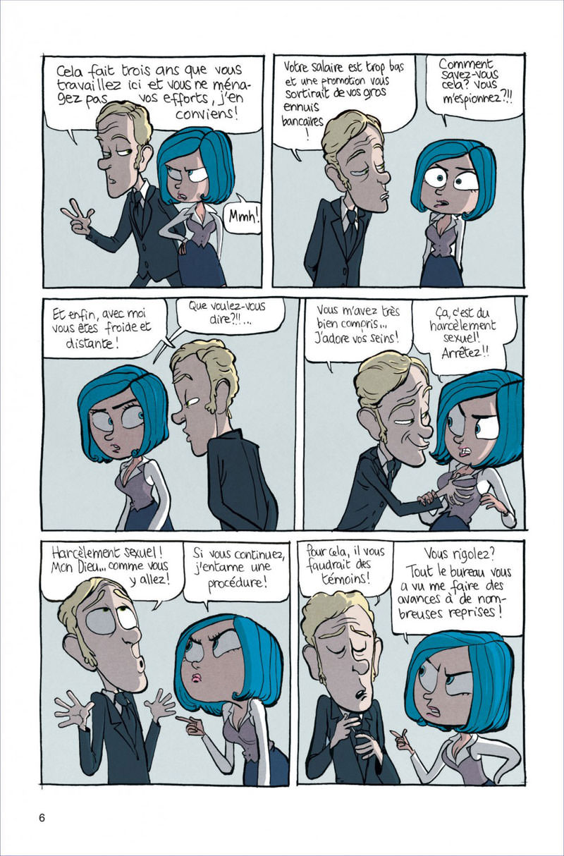 Difficile de classer Gisèle et Béatrice : son sujet pourrait tantôt le situer dans un conte moderne, qui voit la métamorphose et la morale triompher dans un temps, mais aussi une fable érotique, qui ne lésine pas sur les scènes de sexe entre deux femmes, dont l’une dispose d’un sexe masculin... Il ne faut pas oublier le côté dénonciateur de cet album de 2013, aujourd’hui réédité et pleinement d’actualité avec les harcèlements, agressions et viols qui concernent les milieux artistiques, mais qui devraient se dévoiler dans les sphères professionnelles de l’entreprise incessamment sous peu. L’humour est partout, rendant parfois perplexe, arrachant parfois un sourire sardonique sur le renversement de situation. En vérité, ce serait presque du théâtre du travestissement qui s’imposerait, une sorte de pièce pour adulte qui tordrait la réalité pour rendre acceptable ou satirique des situations quotidiennes difficiles à supporter pour les femmes.