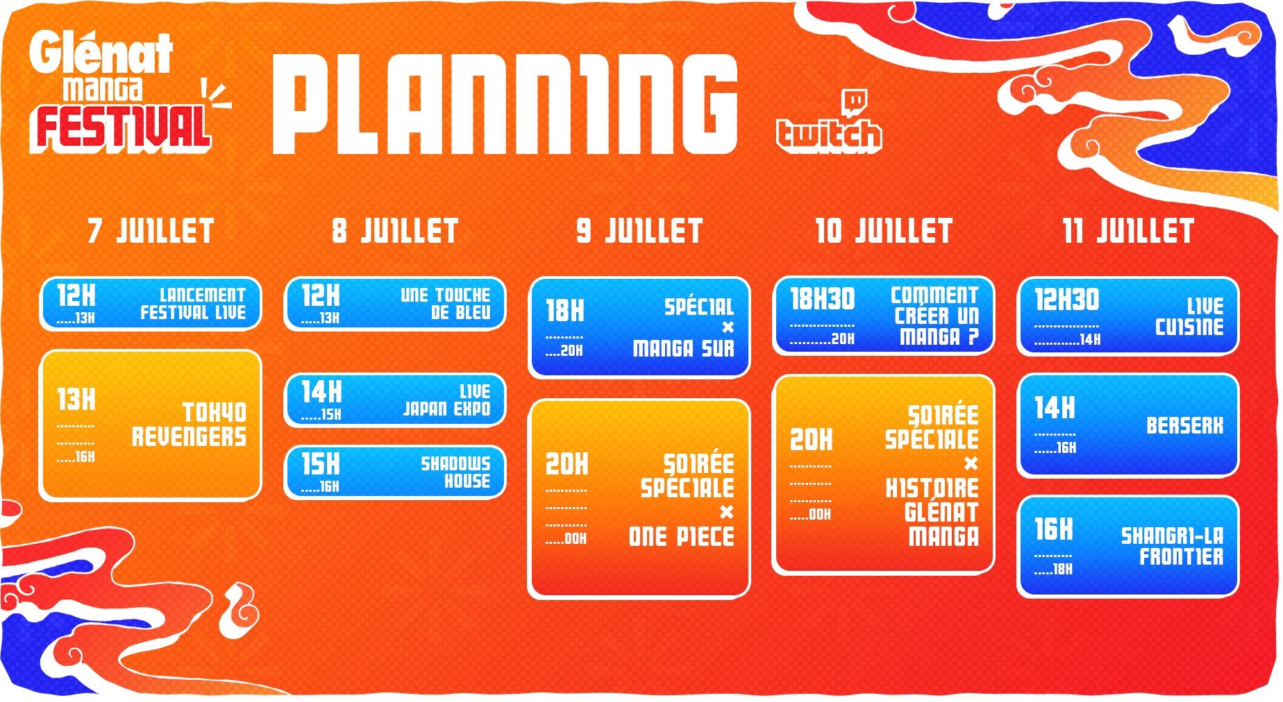 Pour les amateurs de manga, début juillet rime avec la Japan Expo, dont l’édition 2021 a été annulée en raison de la pandémie. Les Éditions Glénat investissent ce créneau pour organiser une manifestation en ligne qui s’adresse d’abord aux lecteurs de leurs franchises. Retransmis sur la plate-forme Twitch, le Glénat Manga Festival prévoit des débats et tables-rondes ainsi que des rencontres avec les auteurs français du catalogue. L’éditeur a diffusé un planning de son festival (voir ci-dessous)