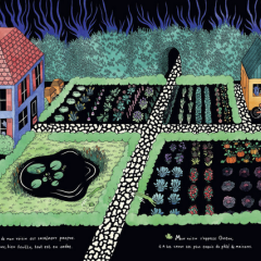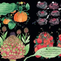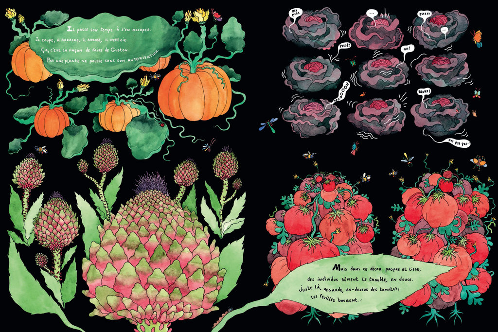 Le contraste entre le début du livre et son dénouement se donne à voir graphiquement : aux légumes de la première page, salades rangées en rang d’oignons sous la supervision du jardinier interventionniste, s’oppose une terre foisonnante et fertile, habitée et grouillante, représentée dans la dernière double page : à l’ordre mortifère d’une nature artificiellement contenue répond le désordre joyeusement chaotique du vivant. La transition s’opère par des doubles pages éclatées où les actions se succèdent ou qui laissent place à des images qui s’étendent sur toute la surface et imposent la force de leur composition. Les couleurs, nuancées, délicates, resplendissent sur des fonds opaques qui les mettent en valeur et placent les animaux comme en apesanteur. L’usage de l’aquarelle et/ou d’encres de couleurs confère une ambiance vaporeuse qui finit d’apporter un ton psychédélique à ce conte déluré.
