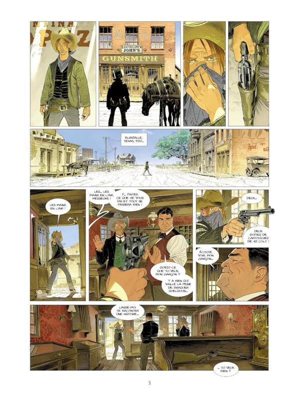 Comme dans chaque tome, il y a un fil conducteur. Cette fois-ci, c’est un armurier qui se fait braquer qui va être la porte ouverte à ces histoires, par les armes qu’il a en vitrine. Ce liant, que l’on peut trouver étonnant, prend son sens à la fin de la BD. En plus de visiter les récits de l’ouest, cela permet aussi de présenter quelques armes accrochées à l’image que l’on se fait du western.