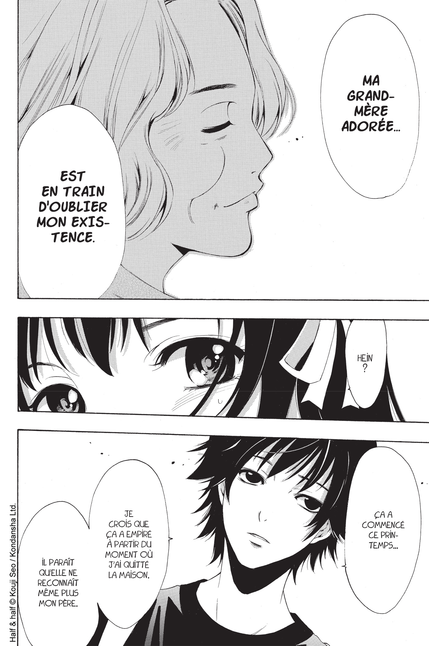 Half & Half T1 et 2 est un manga complet en deux volumes parus simultanément. C’est surtout une histoire touchante comme savent en sortir souvent de leur chapeau les mangakas. Une touche de fantastique, un zeste de romance, une larme de drame, et l’on finit par être pris dans l’épreuve que doivent traverser Shinichi et Yuki.