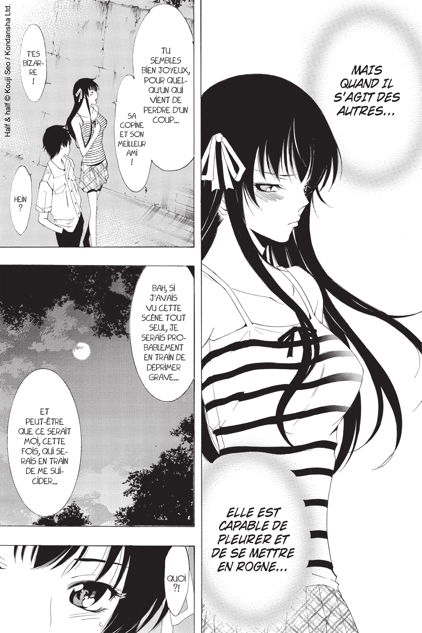 Résumé : Half & Half nous emmène à la rencontre de Shinichi. Ce jeune étudiant voit tomber sur lui du haut d’un immeuble une jeune fille, Yuki. Il ne la rattrape pas, mais elle l’écrase et ils meurent tous les deux. Conter toute attente, l’histoire ne consiste pas en un flashback pour découvrir ce qui les a amené là, mais bien en un récit fantastique où les deux morts se réveillent ensemble et découvrent, par le jeu d’une divinité étrange, qu’ils ont sept jours pour décider lequel des deux va vivre et lequel va... mourir ! Sept jours pendant lesquels ils ne pourront s’éloigner l’un de l’autre sous peine d’endurer d’atroces souffrances.