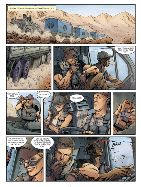 La première impression que l’on a à la lecture de Harde Rescue est celle de lire ce qui pourrait être une adaptation en bande dessinée d’un film d’action, un blockbuster. On y retrouve presque l’intégralité des codes, mais également du découpage et du scénario. L’ouvrage débute sur une dangereuse mission de l’équipe de la Hard Rescue, elle-même composée de personnages aux caractères affirmés et ayant tous leur spécialité pour le combat. S’en suit la rencontre avec un énigmatique multimilliardaire, qui semble poussé par de mystérieuses raisons d’explorer l’artefact, puis la découverte jour après jour d’éléments tous plus terrifiants les uns que les autres de ce qui s’y est déroulé. Mais les héros sont braves, bien équipés, et plein de ressources face à l’adversité. Les dialogues, mais également le découpage sont très cinématographiques. On remarque régulièrement des plans de coupe, des flashbacks illustrant le passé de certains personnages et des échanges bardés d’humour quelque peu potache.