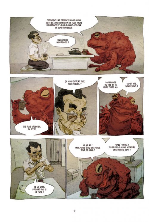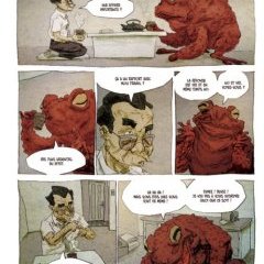 Murakami est un monument de la littérature contemporaine, c’est une tautologie que l’on ne développera pas, tant ces neuf nouvelles respirent l’écriture et la réécriture, l’intertextualité et la double lecture. Mettre le nom de l’auteur en gros caractères sur la couverture était donc évident, mais l’on s’intéressera davantage au traitement que nos auteurs français lui ont réservé. C’est une vitalité nouvelle, neuve, au sens du support qui vient égayer un texte qui serait assurément ardu, rêche, peut-être sec. Ce n’est pas un hasard si la bulle fait partie du lexique de la bande dessinée, car l’élément liquide imprègne chaque histoire, enveloppe les récits, que ce soit un animal totem, une impression de noyade, un jet de sang... Les yeux globuleux aussi, les grimaces, permettent au texte de se doubler d’une sensation visuelle étrange mais vivante. Les livres sont mis à l’honneur, les auteurs russes en particulier, mais l’histoire la plus touchante est peut être cette Métamorphose de Kafka inversée, revisitée, drôle et fine, qui dans cet album semble donner vie à Kafka et Murakami en même temps.