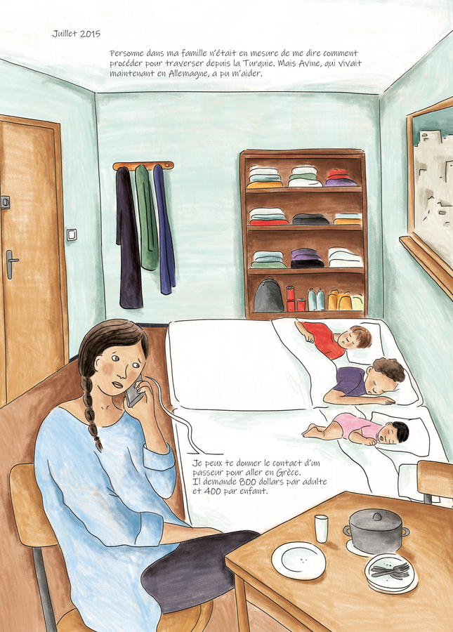 Les autrices racontent joliment les bonheurs simples de la vie, mais aussi les débuts de la guerre civile en Syrie : la bascule du gouvernement, le début des tensions... puis l’escalade de la violence, la dégradation rapide des conditions de vie, l’horreur quotidienne et la peur constante. Enfin on nous conte, simplement et sans fard, l’exil et le parcours d’une migrante, seule sur les routes avec ses enfants, aux mains des passeurs, découvrant et endurant la faim, le froid, la fatigue, la peur, et la marche qui n’en finit pas à travers l’Europe.