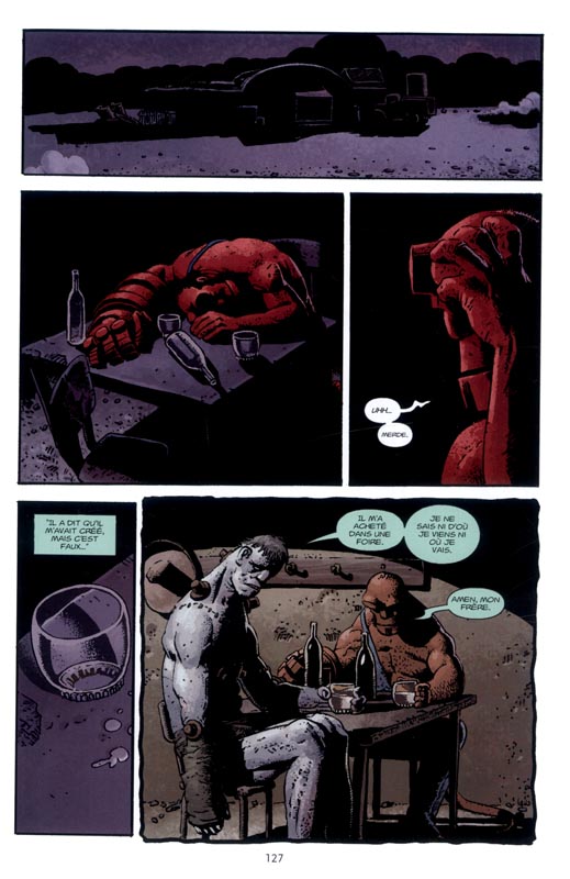 Au niveau du scénario, les différentes histoires sont un vrai fourre tout fantastique : de frères luchadors chasseurs de vampires, le mariage d’Hellboy avec une fantôme, des momies aztèques, bref du grand n’importe quoi, mais encore une fois l’intérêt est ailleurs. La manière de traiter les événements, tantôt de façon ésotérique, tantôt de manière très terre à terre, fait que chaque récit a ses particularités, et parvient à faire oublier les faiblesses (pour ne pas dire l’absence) de trame... De toute façon, à la fin, Hellboy va cogner les méchants avec son poing ravageur, le lecteur commence à être habitué... Petite dédicace au monstre de Frankenstein qui a droit, après un album solo entier, à apparaître en guest star dans un combat épique de monstres sacrés. La principale information scénaristique restant cependant que notre héros écarlate apprécie la tequila, puisqu’il s’en est rincé l’estomac et le foie jusqu’à oublier cinq (volontairement ou non) mois passés de l’autre côté de la frontière.
