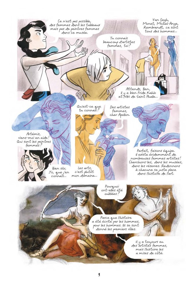 Le récit est construit à partir des questionnements de deux adolescents : Jo et Ben. Visitant un musée, ils s’étonnent de ne trouver quasiment aucune femme signataires des œuvres exposées alors qu’elles sont abondamment les sujets de celles-ci. Faisant fi de la frontière entre le présent et le passé, ils décident de convoquer les divinités Artémis et Apollon. Et tous les quatre débutent alors un voyage à travers l’histoire de l’art à la recherche des artistes féminines.