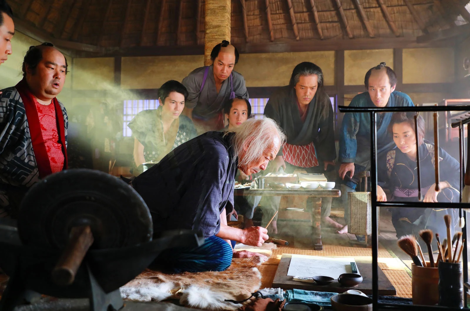 Force est de constater que les décors et les costumes sont très soignés. Hajime Hashimoto entraîne le spectateur dans l’univers sombre et tourmenté d’Edo. Si cette période a fortement contribué à l’hégémonie japonaise et à l’unité culturelle du pays, on perçoit combien l’art du dessin est manipulé par les autorités pour imposer un seul modèle social et intellectuel. La caricature est raillée, le réalisme mis à mal. En même temps, on découvre avec le film l’invention de l’imprimerie, permettant à Hokusai de diffuser ses estampes au plus grand nombre, mettant de fait au défi la propagande de l’État.