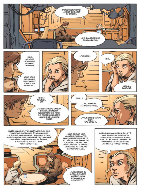 Résumé : Nous sommes en 2020. Volontaire du programme de survie américain Hope One, Megan se réveille dans une capsule spatiale après un sommeil de 49 ans. La Terre est plongée dans un hiver nucléaire depuis que la Guerre Froide a dégénéré en guerre totale… Si la jeune femme est prise en charge par son partenaire de bord, elle souffre d’amnésie. Avec une question lancinante : quel intérêt d’avoir survécu à l’apocalypse si tout retour sur Terre est impossible ? Les jours s’écoulent dans une routine monotone, mais problèmes et conflits ne tardent pas à surgir…