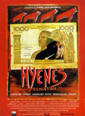 Hyènes est adapté de la célèbre pièce de théâtre La Visite de la vieille dame, du dramaturge suisse Friedrich Dürrenmatt, ici transposée à Colobane, ville natale du cinéaste. Il a mêlé le matériau du texte d’origine « à des souvenirs personnels liés à la vision d’une prostituée hautaine qui l’obséda durablement pour qu’il envisage, dans un premier temps, de lui consacrer une biographie romancée » (Raphaël Bassan). Mambéty réussit ainsi le pari de greffer un matériau littéraire externe à des préoccupations qui lui sont spécifiques, et de rendre crédibles des situations qui auraient a priori pu paraître déplacées dans une fiction située au Sénégal. La pièce de Dürrenmatt était déjà un brûlot féministe en son temps, et une dénonciation sans concessions des lâchetés collectives et des compromissions auxquelles pouvait se livrer un pouvoir politique, même si ce n’est qu’un petit territoire qui est concerné. En relatant la vengeance d’une vieille africaine désormais enrichie mais spoliée de ses droits élémentaires en raison d’une injustice dont elle fut victime dans sa jeunesse, le réalisateur aborde des thèmes sensibles qui s’appliquent à l’Afrique depuis les années 60, à savoir la résurgence d’un néocolonialisme par le biais de la domination économique, ou le dilemme entre la volonté d’imiter les normes occidentales (savoureuse scène d’une vente de réfrigérateur) et le désir de rester fidèle aux valeurs ancestrales.
