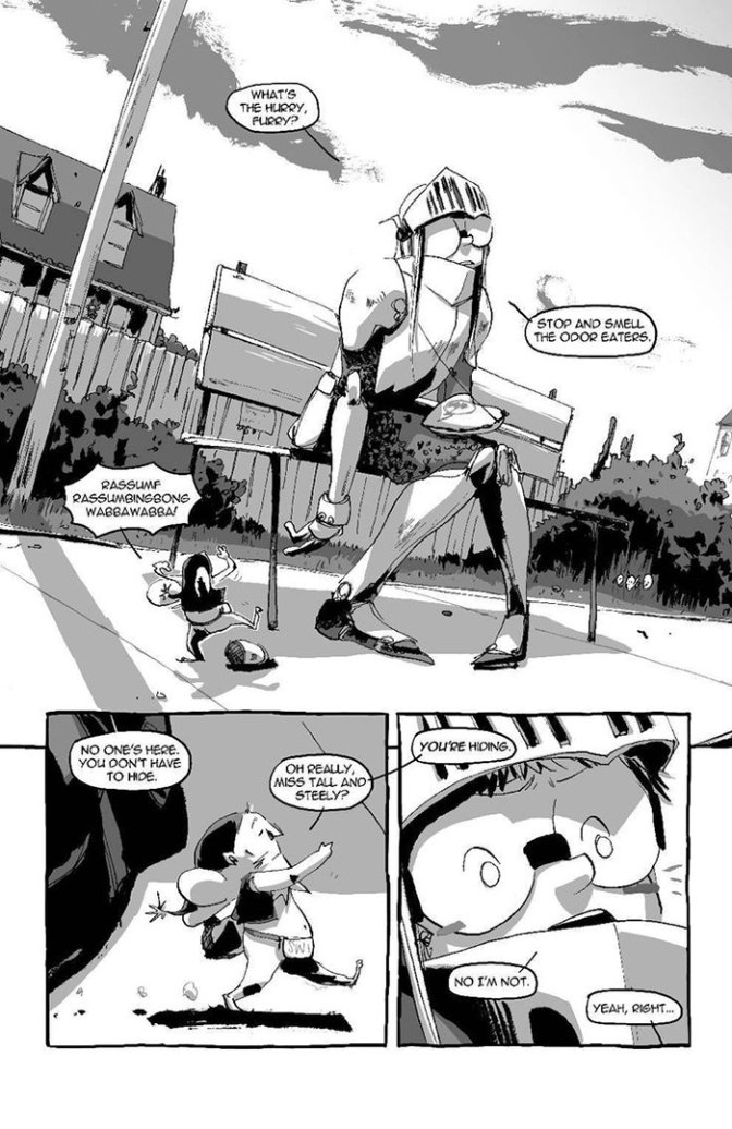 Et que dire du style graphique de Niimura ? C’est beau ! C’est un dessin plein de vie et de mouvement. Il est à l’image de Barbara, jeune et plein d’espoir, parfois sombre mais souvent juste et touchant. À mi-chemin entre un manga et un long comic strip, le dynamisme créé par Niimura prend dès les premières pages et le choix délibéré du noir et blanc lui offre tout loisir pour créer un jeu d’ombres et d’ambiances pesantes à l’approche des géants. Joe Kelly et Ken Niimura ont réussi à créer une œuvre de très grande qualité qui mériterait bien cinq étoiles sur les quatre maximum car face à cet album, chacun d’entre nous est un colosse aux pieds d’argiles qui n’attend plus que le coup de marteau de Barbara pour tomber sous le charme de cette magnifique histoire.