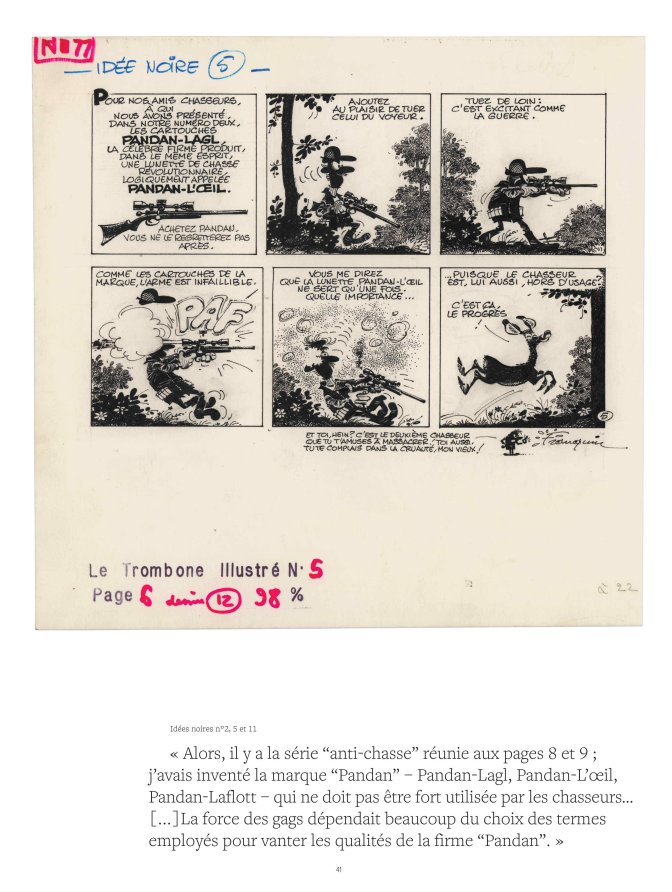 Critique : Ce catalogue d’exposition, reprenant les images et photos dévoilées au festival Quai des bulles, est impressionnant. C’est l’occasion unique de découvrir André Franquin au travail sur ce projet hors norme, et de voir aussi avec quelle dureté, parfois, il juge ses propres dessins. Ces idées noires sont en fait un recueil d’histoires courtes sur une demi-page, ou une page en noir et blanc, au trait, dénonçant les travers de notre monde, militarisme forcé, société de consommation, inégalité des richesses, trafic d’armes... Mais avec humour, un humour noir, parfois gore. Contrairement à leur titre, ces idées noires ne sont donc pas tristes, mais bien orientées vers la rigolade, comme Franquin l’annonce lui-même dans une citation dès le revers de la jaquette, « ce sont des histoires un peu sadiques, un peu cruelles, tout en restant rigolardes ».