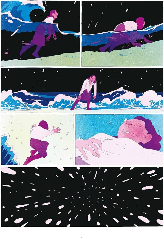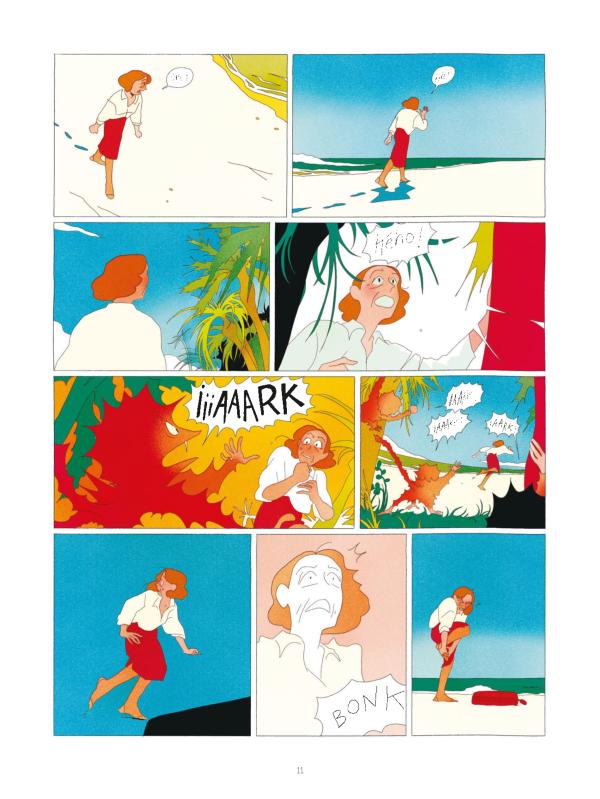 Cette évasion, ce détachement, cette liberté, toutes ces émotions sont permises par le dessin qui ouvre des perspectives originales et intéressantes. La couleur, tout d’abord, intense et fruitée, qui semble parfumer les pages tant elles respirent de fuchsia, de vert corail, de grenat et d’abricot, pour créer au milieu de l’ouvrage un paradis retrouvé, un véritable Éden au cœur de l’album. Les formes ensuite, qui semblent couler, se languir, pas si éloignées d’un Gauguin en Polynésie, s’étaler et s’exalter, montrant de la peur, de l’espoir et aussi de l’amour dans les corps. Enfin les regards, les sourires et les respirations même, qui dévoilent les cœurs après les corps, autant de petits points, de petits traits qui en disent long sur ce que veut faire ressentir l’ouvrage.