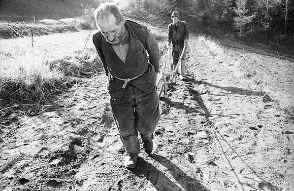 Ces vieux paysans sont indissolublement liés à leur environnement au point que, comme le dit le texte d’exergue, les transplanter serait impossible, ils en mourraient. Hanák les filme au travail, exécutant encore les tâches les plus ardues malgré l’âge, la maladie, parfois avec un bras, une jambe en moins, voire les deux comme cet homme dont les pieds ont été écrasés autrefois par une charrette et qui, obligé de se traîner à quatre pattes, a construit une maison assis et continue de s’occuper de ses bêtes.