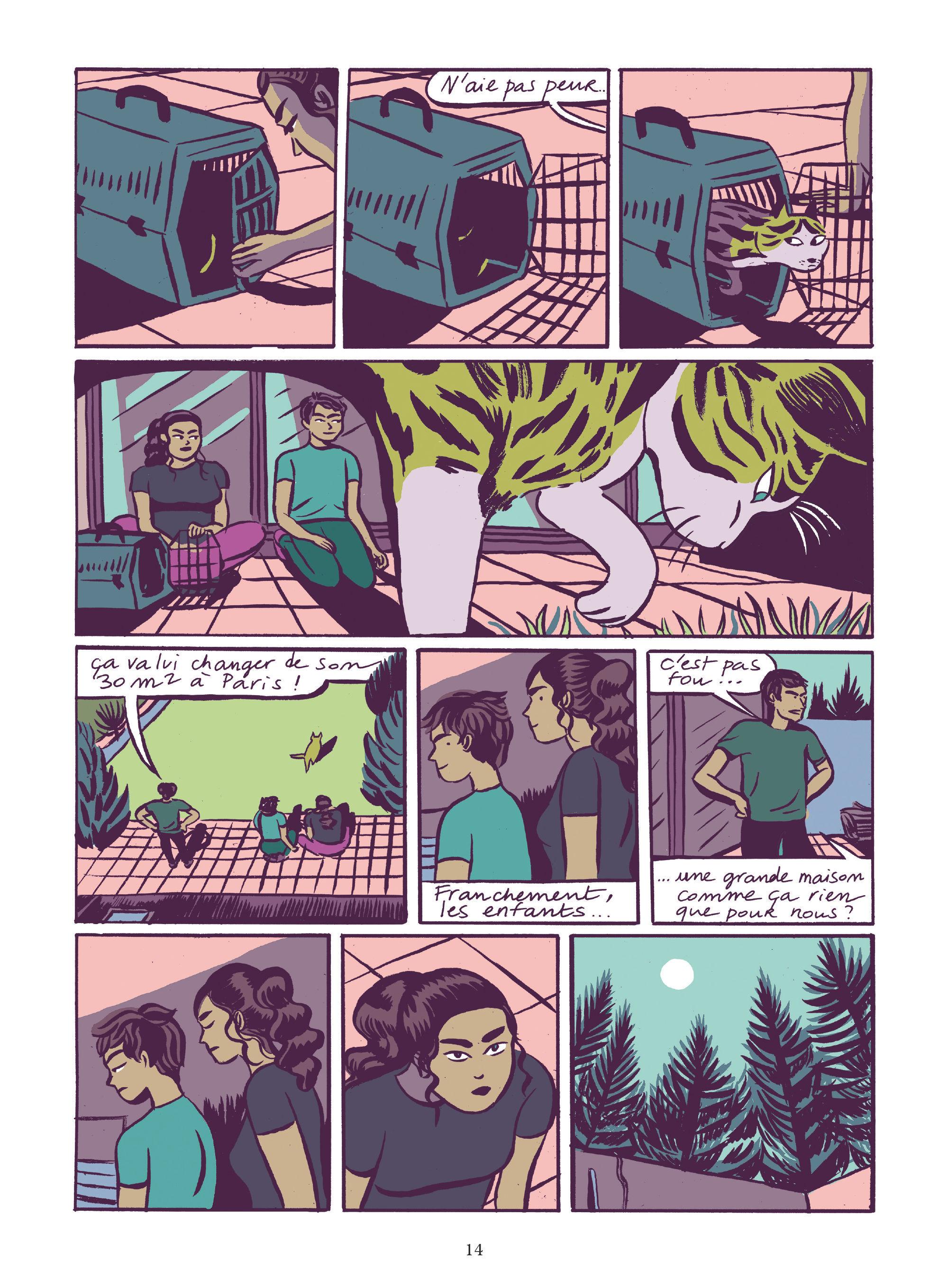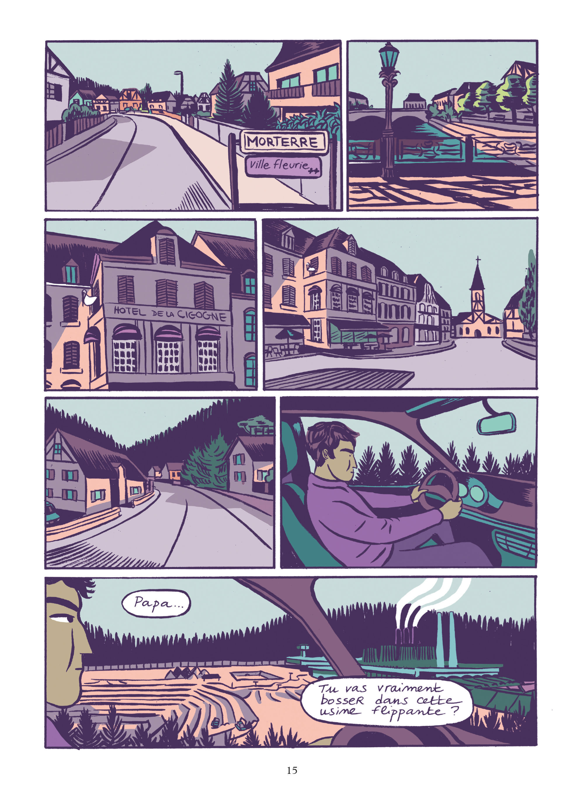 La proposition graphique d’Élisabeth Holleville séduit surtout par son choix très pertinent de mise en couleurs, avec une prédominance de violet et de vert. La colorisation confère une véritable ambiance de mystère au récit. Les décors construits par l’autrice correspondent pleinement aux codes du genre : une ville encerclée par la forêt, un cours d’eau pollué, des lotissements. Elle maîtrise parfaitement les codes du fantastique et de l’horreur. Un seul bémol : la figuration des créatures est un ton en dessous des autres dessins, sans que cela gêne pour autant le bon déroulé de la lecture.
